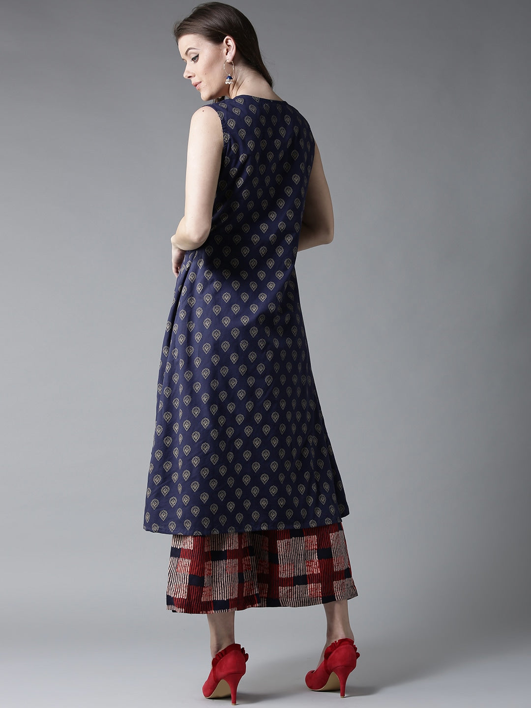 HERE&NOW Women Navy Blue & Maroon Printed Kurta with Palazzos