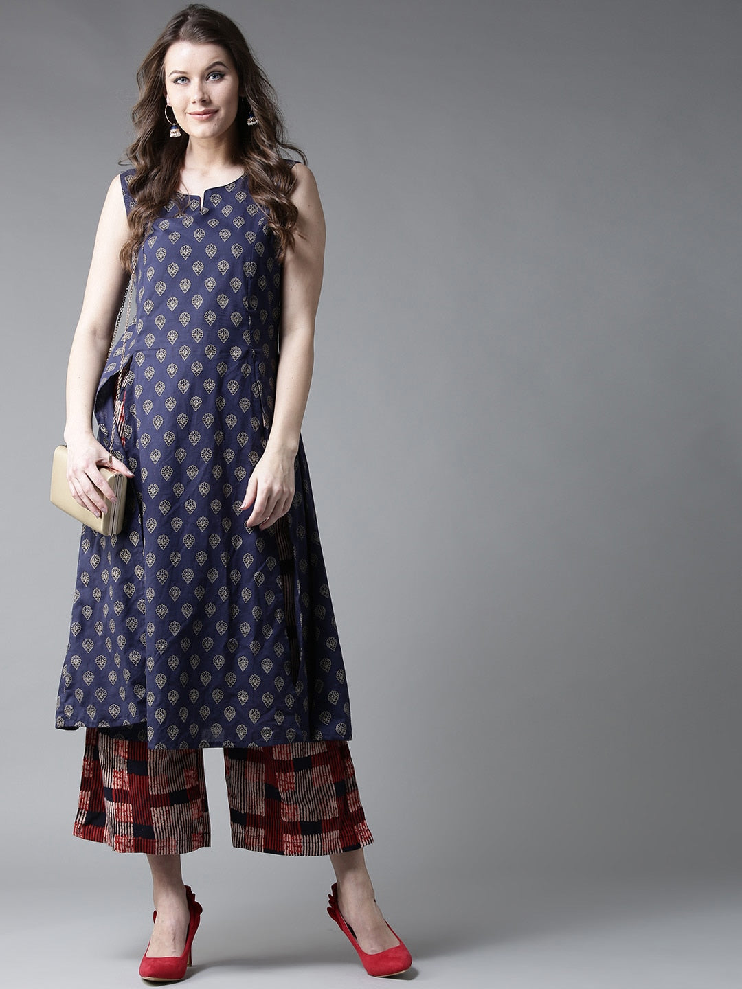 HERE&NOW Women Navy Blue & Maroon Printed Kurta with Palazzos Product Details Navy Blue and maroon printed kurta with palazzosNavy Blue ...