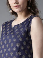 Navy Blue printed A-line calf length kurta, has a round neck, sleeveless, flared hem, multiple slits