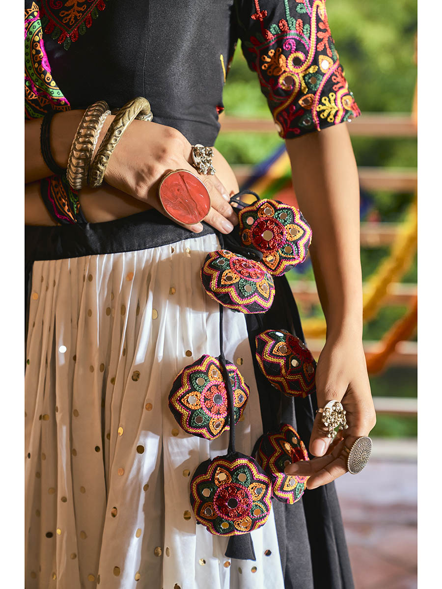 Black and White Maslin Cotton Embroidered Navratri Special Lehenga features a maslin cotton lehenga and choli. Embroidery is completed with Sequins ,thread and mirror work. This Style is made in India and checked by hand to ensure high quality.