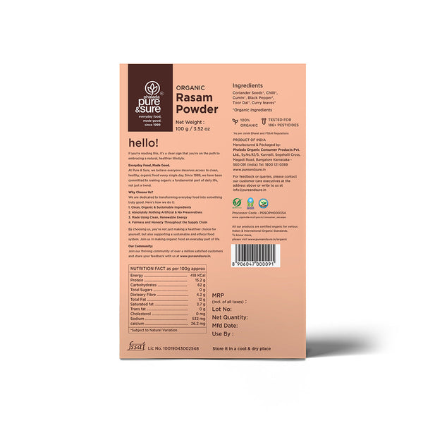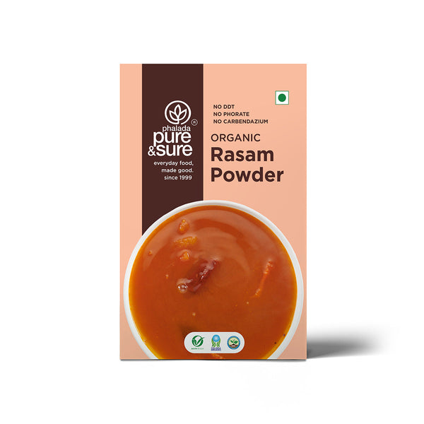 Pure & Sure Organic Rasam Powder is an authentic South Indian blend made the traditional way, using certified organic spices roasted gently to protect their natural aroma and flavour. The mix balances pepper, cumin, coriander, and tangy tamarind notes, giving you a rasam that tastes clean, comforting, and homemade without any additives or artificial enhancers.
