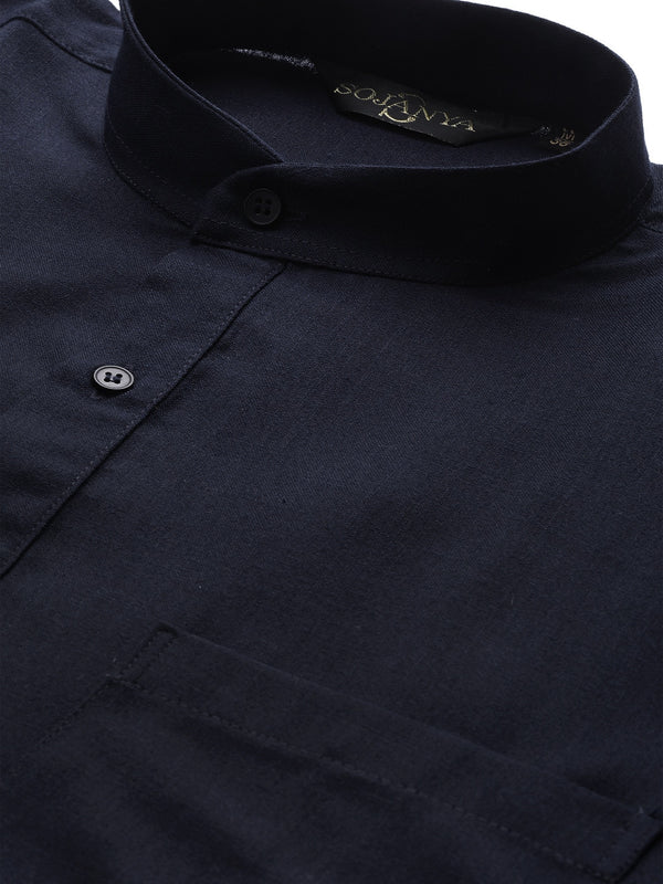Sojanya Men Navy Blue Solid Straight Kurta Product Details The Navy Blue solid straight kurta, has a mandarin collar, button closures, long slee...