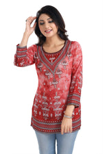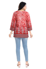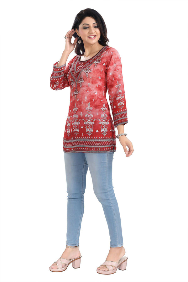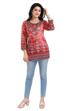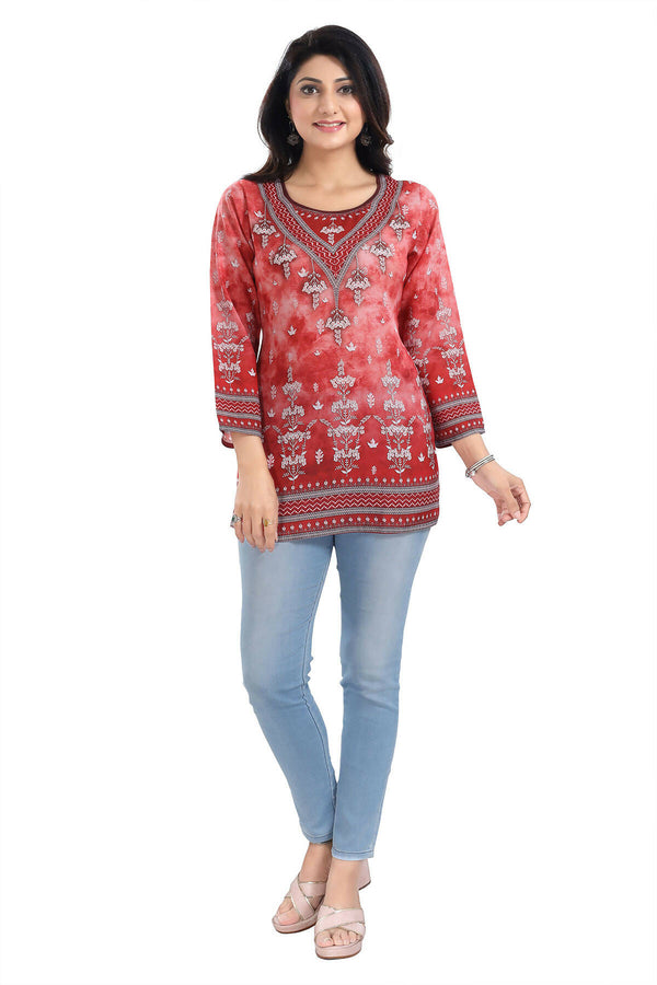 Snehal Creations Rustic Rust Faux Crepe Printed Short Kurti Tunic Top Color: Red Material: Faux Crepe Legal Disclaimer: Product color may slightl...