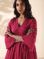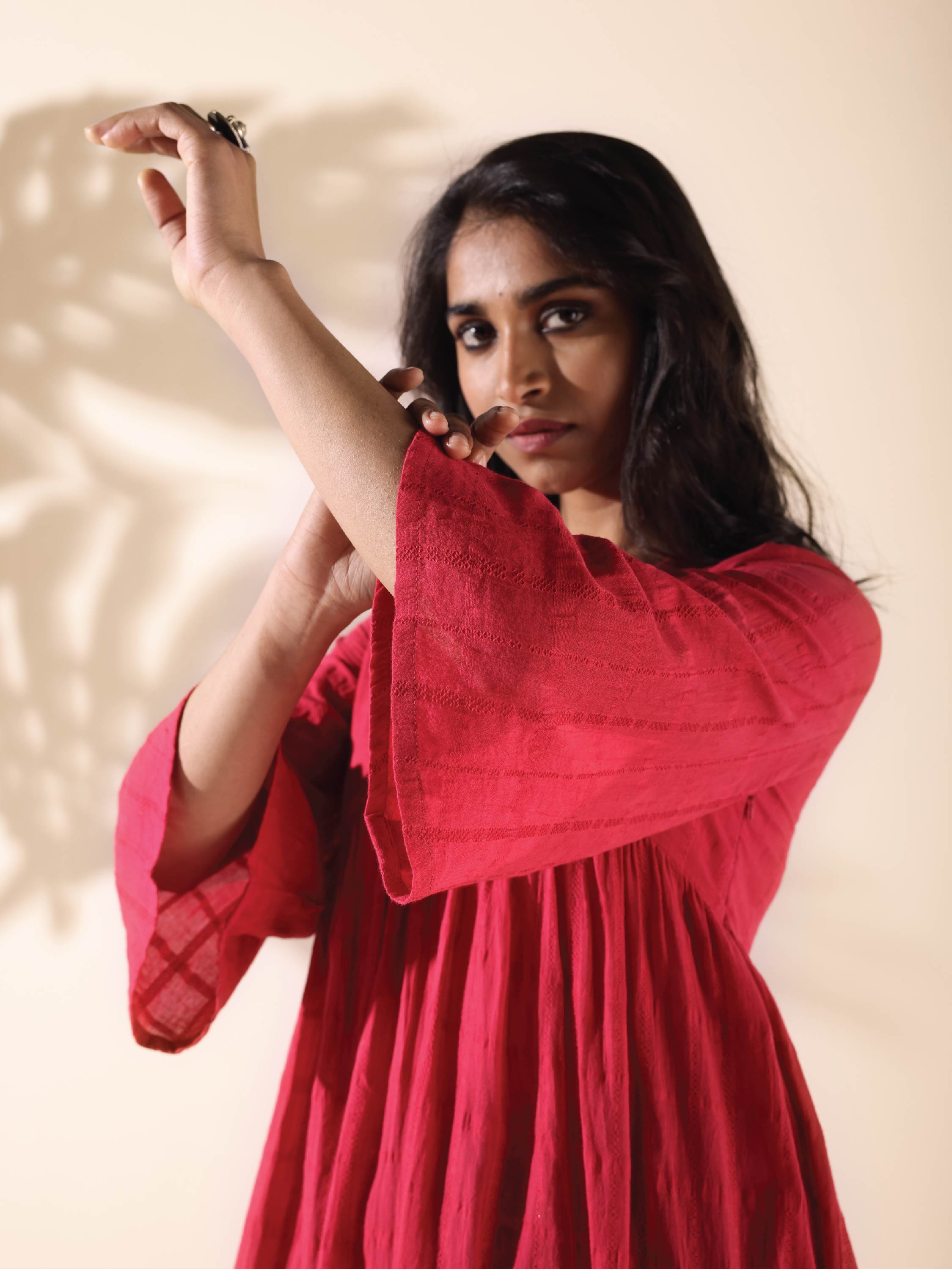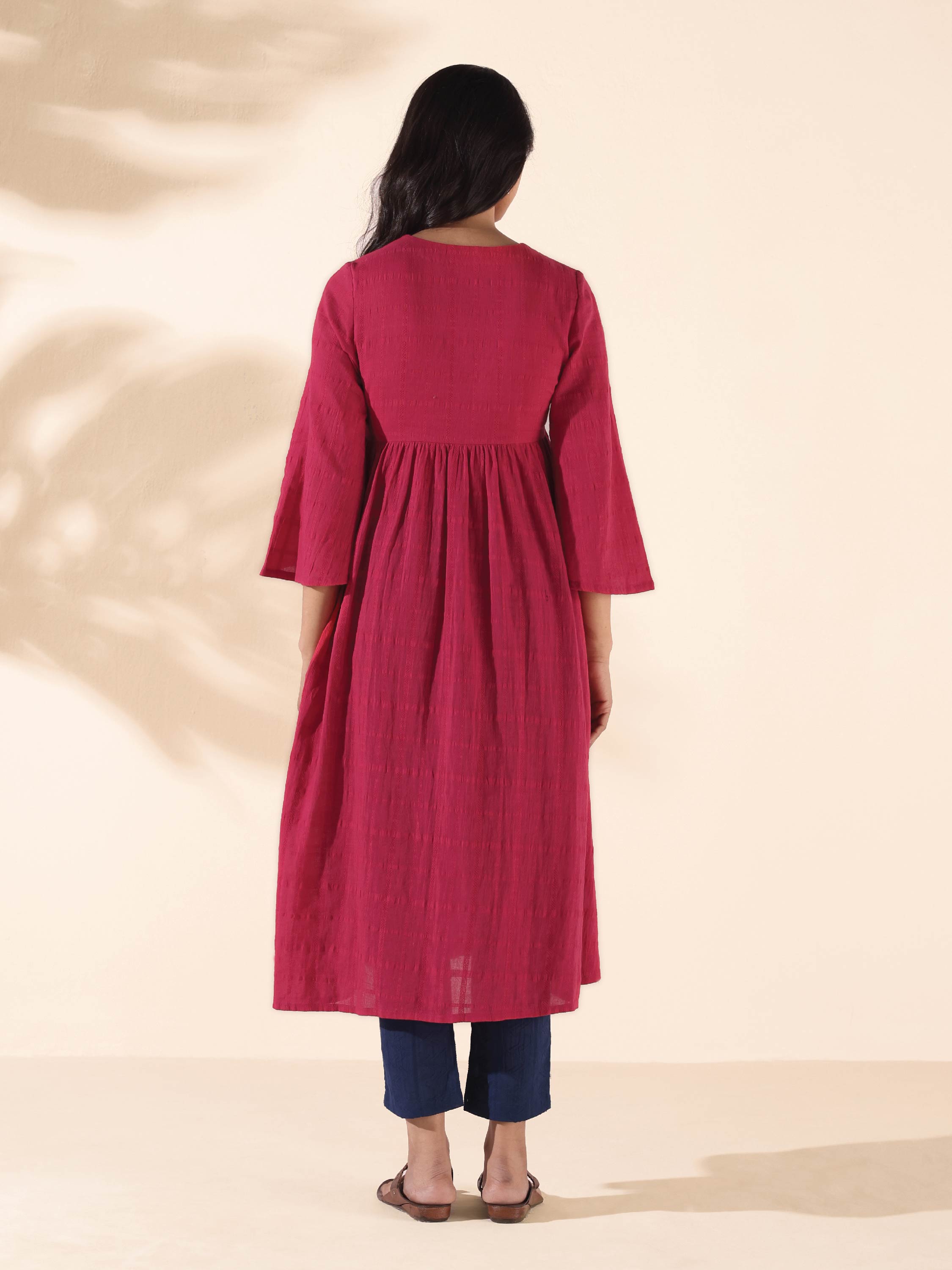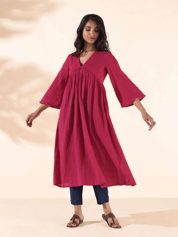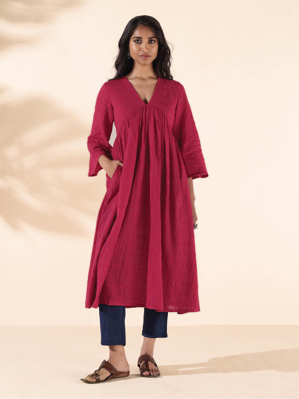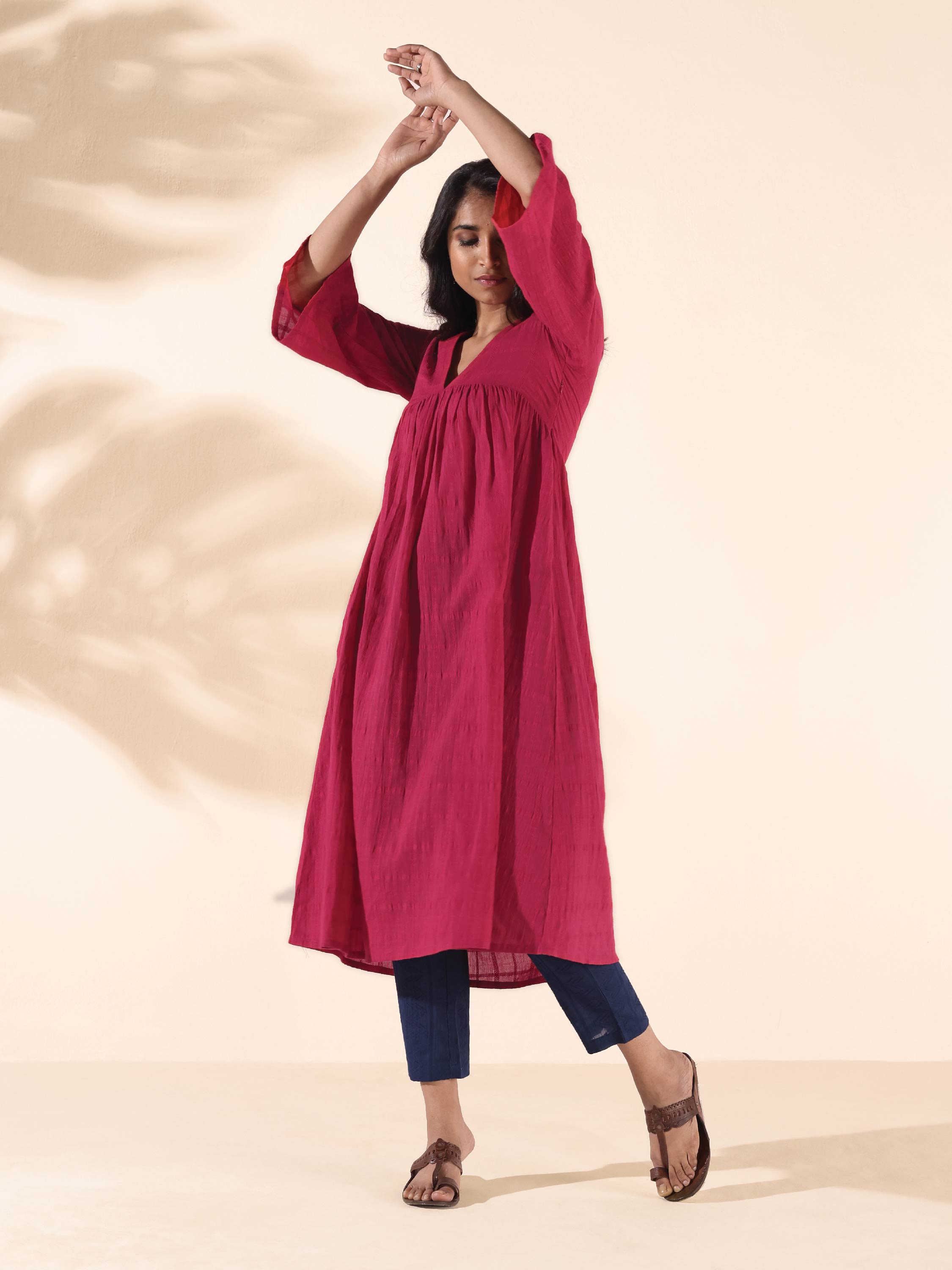 • Cotton Dobby Kurta with gathered yoke, flared sleeves and overlap V-neckline. Paired with contrast elasticated waist pant.