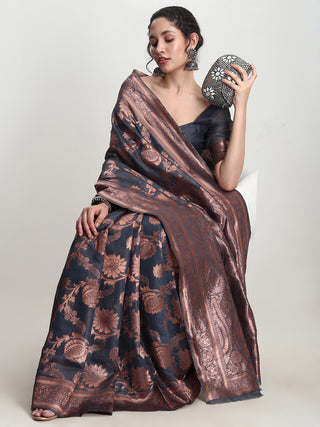 Janasya Dark Grey Silk Blend Floral Jacquard Saree