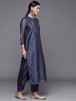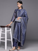 Varanga Women Navy Blue Bandhani Printed Straight Kurta With Three Quarter Sleeves Paired With Tonal Bottom And Printed Dupatta - S