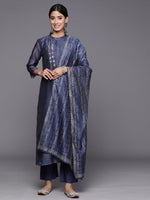 Varanga Women Navy Blue Bandhani Printed Straight Kurta With Three Quarter Sleeves Paired With Tonal Bottom And Printed Dupatta