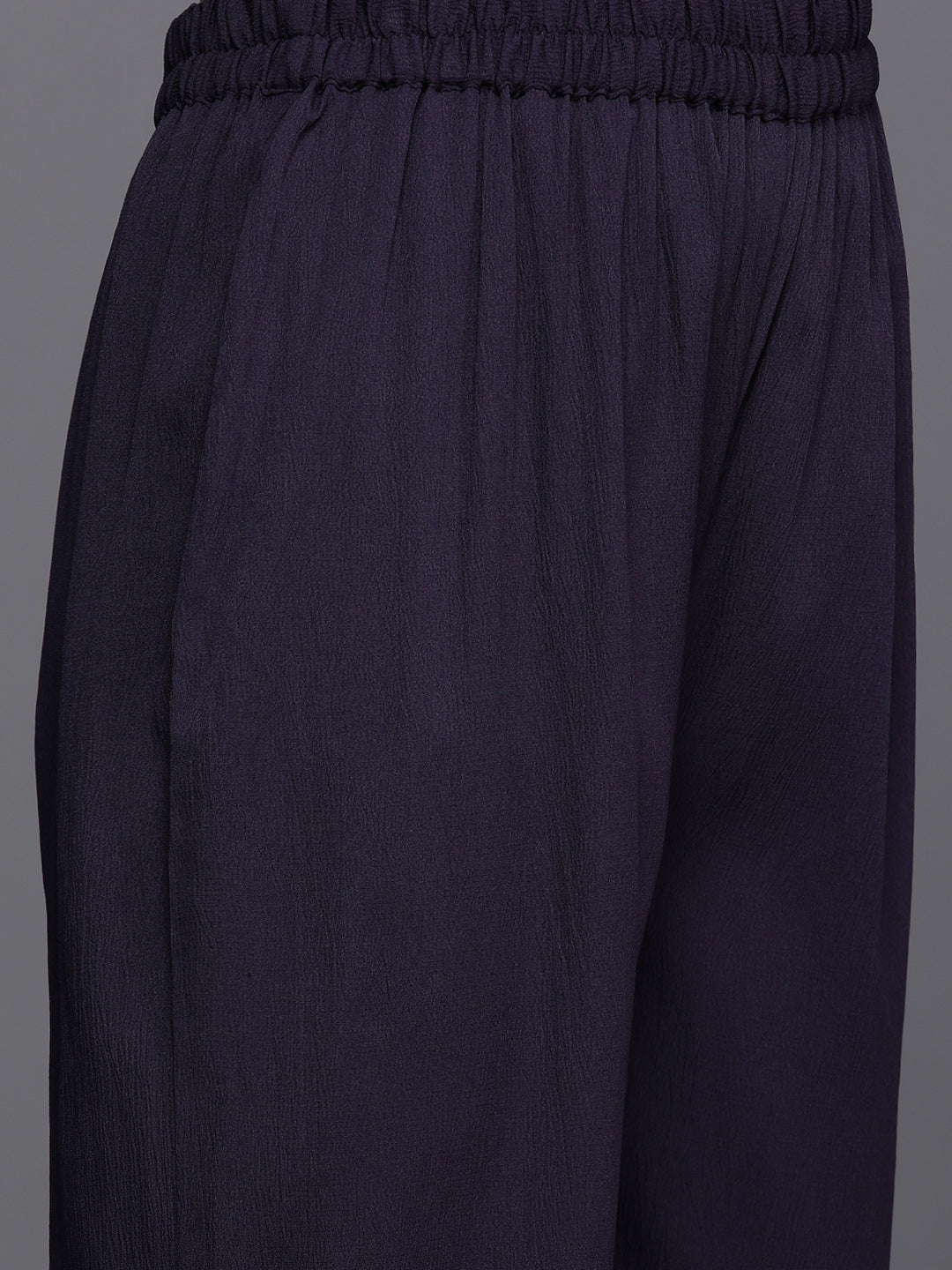 Navy Blue V Neck With Cotton Lace Detailed, Three Quarter Puff Sleeve Straight Kurta With Side Slit Paired With Tonal Bottom