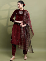 Vishudh Women Floral Embroidered Knitted Velvet Kurta with Trousers & With Dupatta - S