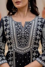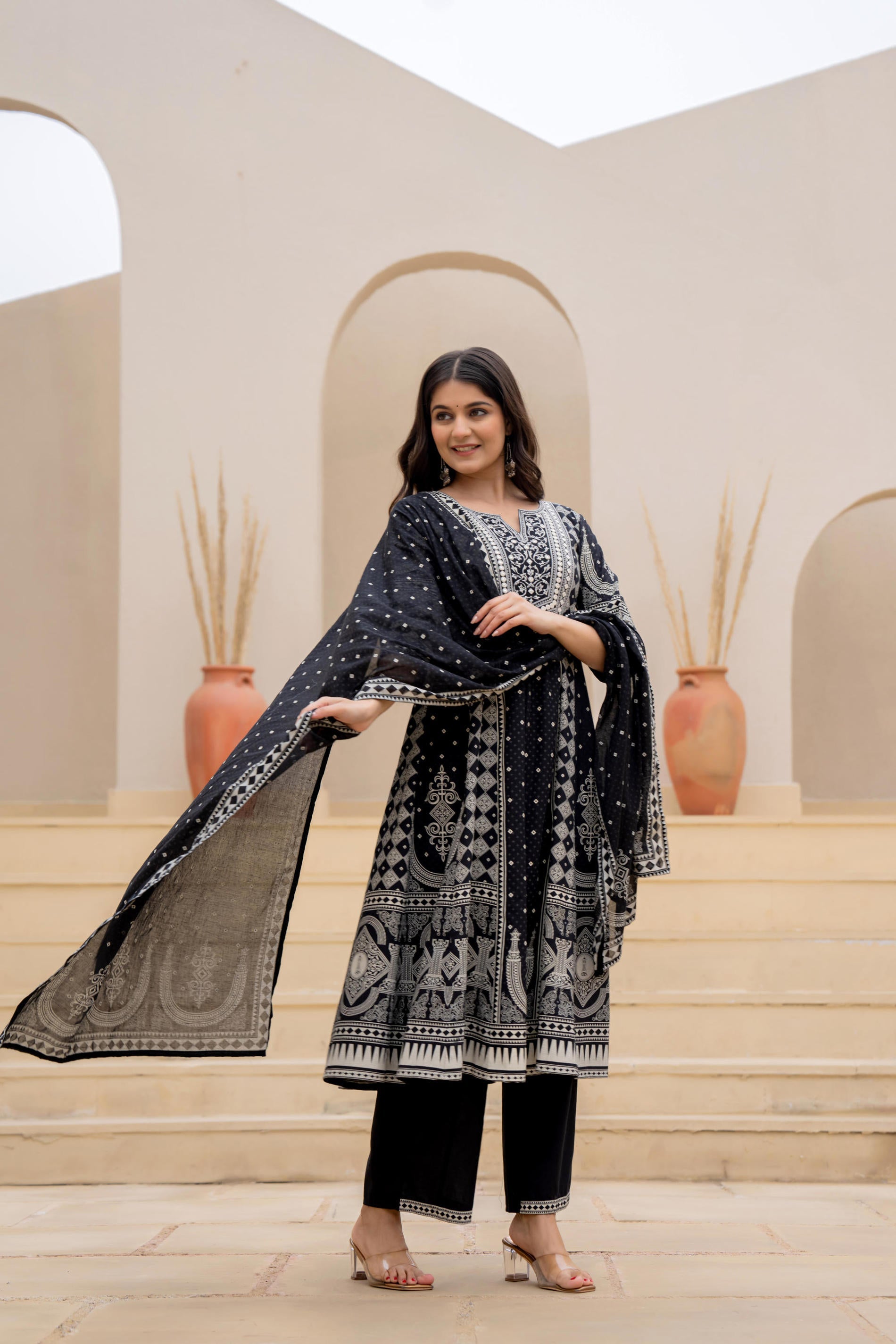 Black Ethnic Motif Printed Kurta Set showcases intricate thread and mirror work, adding a touch of sophistication. The knee-length fit & flare silhouette, notch neckline, and three-quarter regular sleeves offer a timeless appeal. Paired with printed slip-on pants and a coordinating printed dupatta