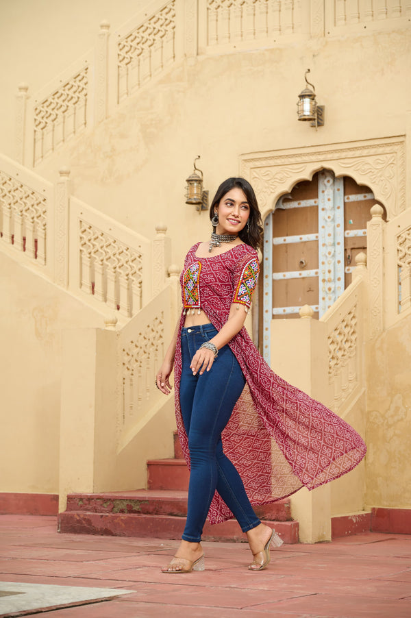 Prazu Fashion Maroon Georgette Bandhani Print With Kutchi Patch work Navaratri Kurti