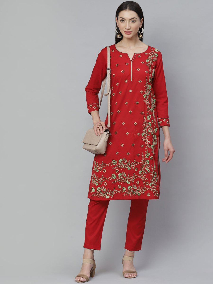 Red and green Chikankari hand embroidered straight calf length kurta, has a notched round neck, three-quarter sleeves, straight hem, side slits