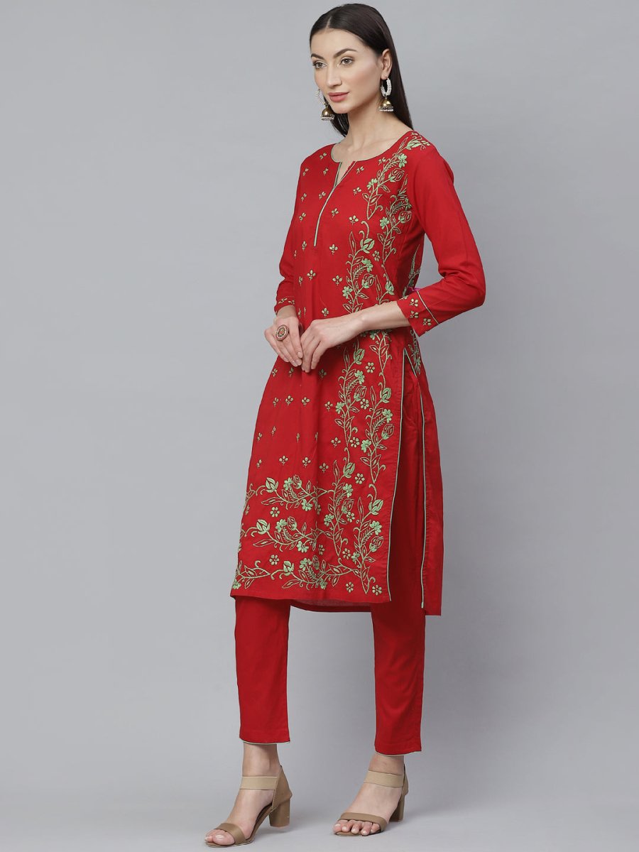 ADA Women Red & Green Chikankari Hand Embroidered Sustainable Handloom Kurta with Trousers Product Details Red and green Chikankari hand emb...