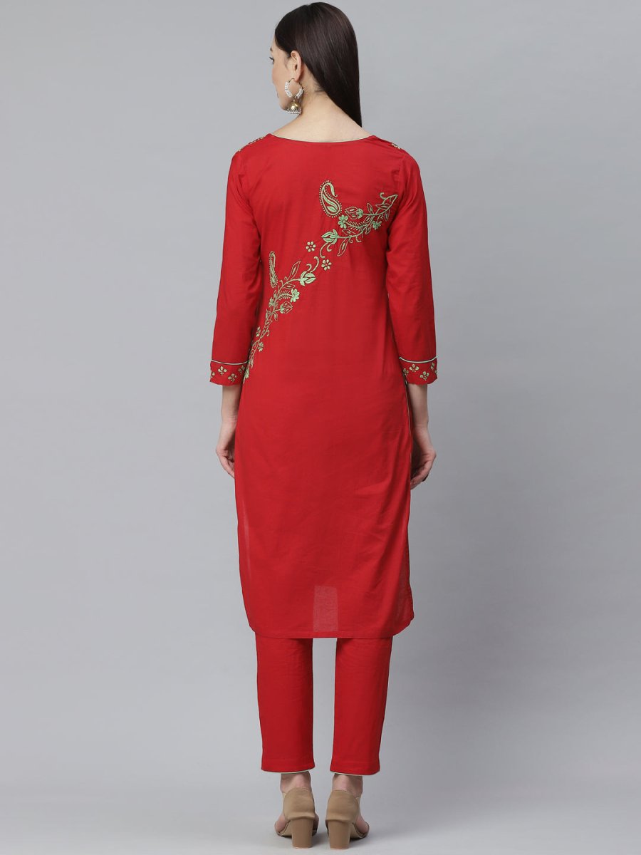Red and green Chikankari hand embroidered kurta with trousers