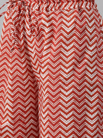 Maroon and white printed palazzos, has a drawstring closure