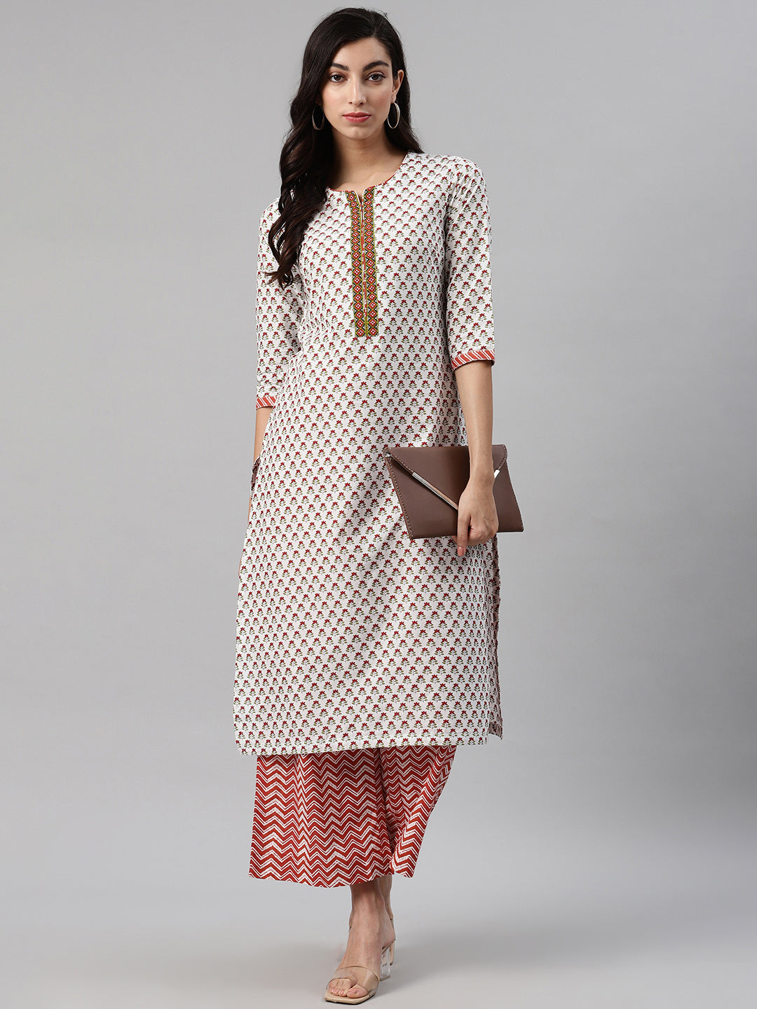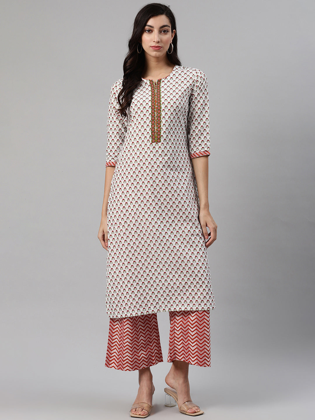 White and maroon printed straight calf length kurta, has a round neck, three-quarter sleeves, straight hem