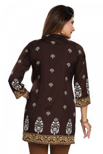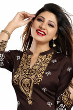 Swell up in this design par excellence named Endearing Ethnicity Short Brown Tunic for Women by store house of latest fashion, Snehal Creation. This ban collared beauty is made of poly. Crepe and comes with interesting prints on it that make an elaborate neck panel, border for the base, sleeve edges and are scattered here and there. This full sleeve kurti is a break from the usual long tunics with its short length and crisp silhouette.