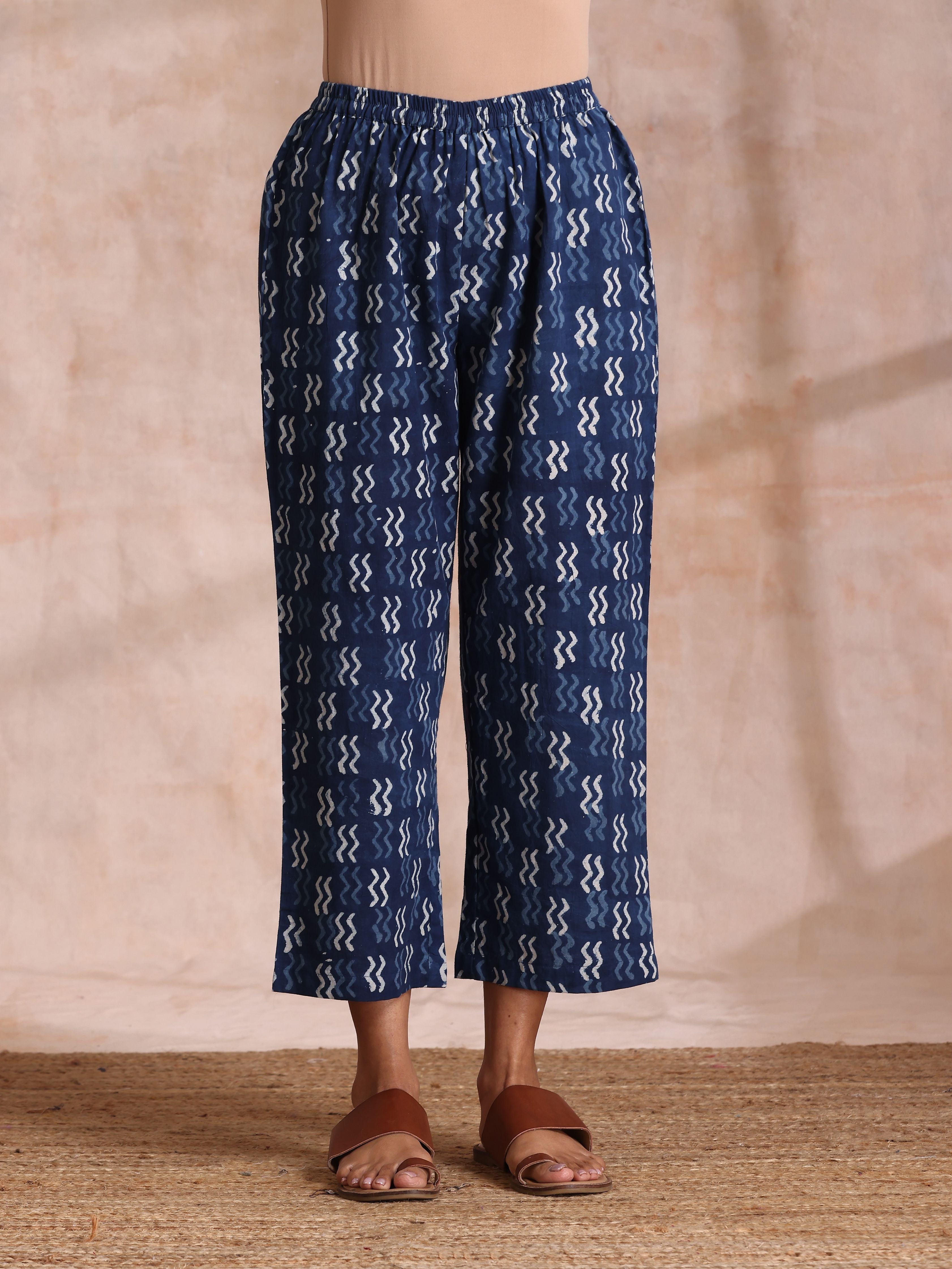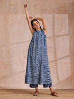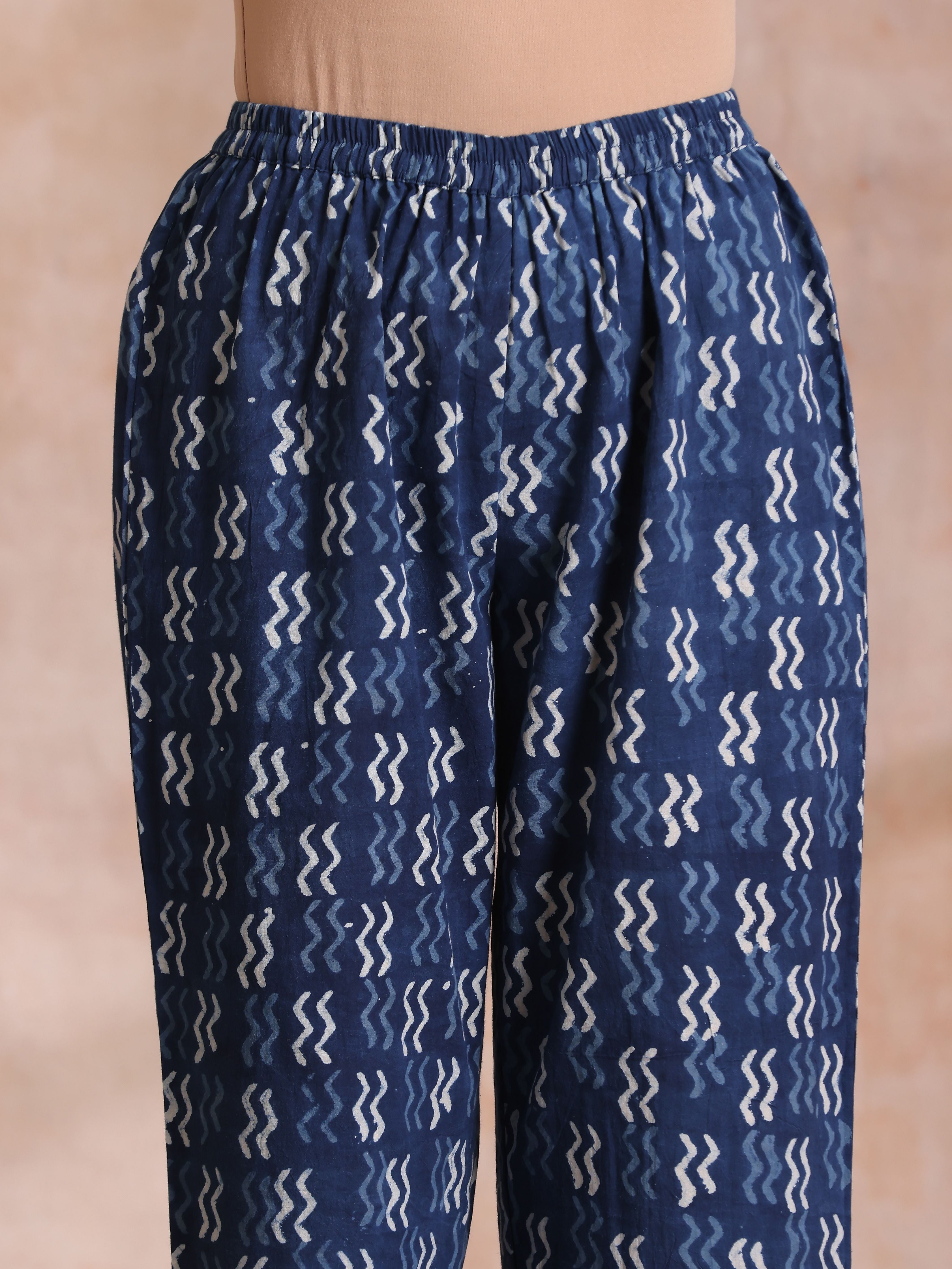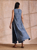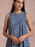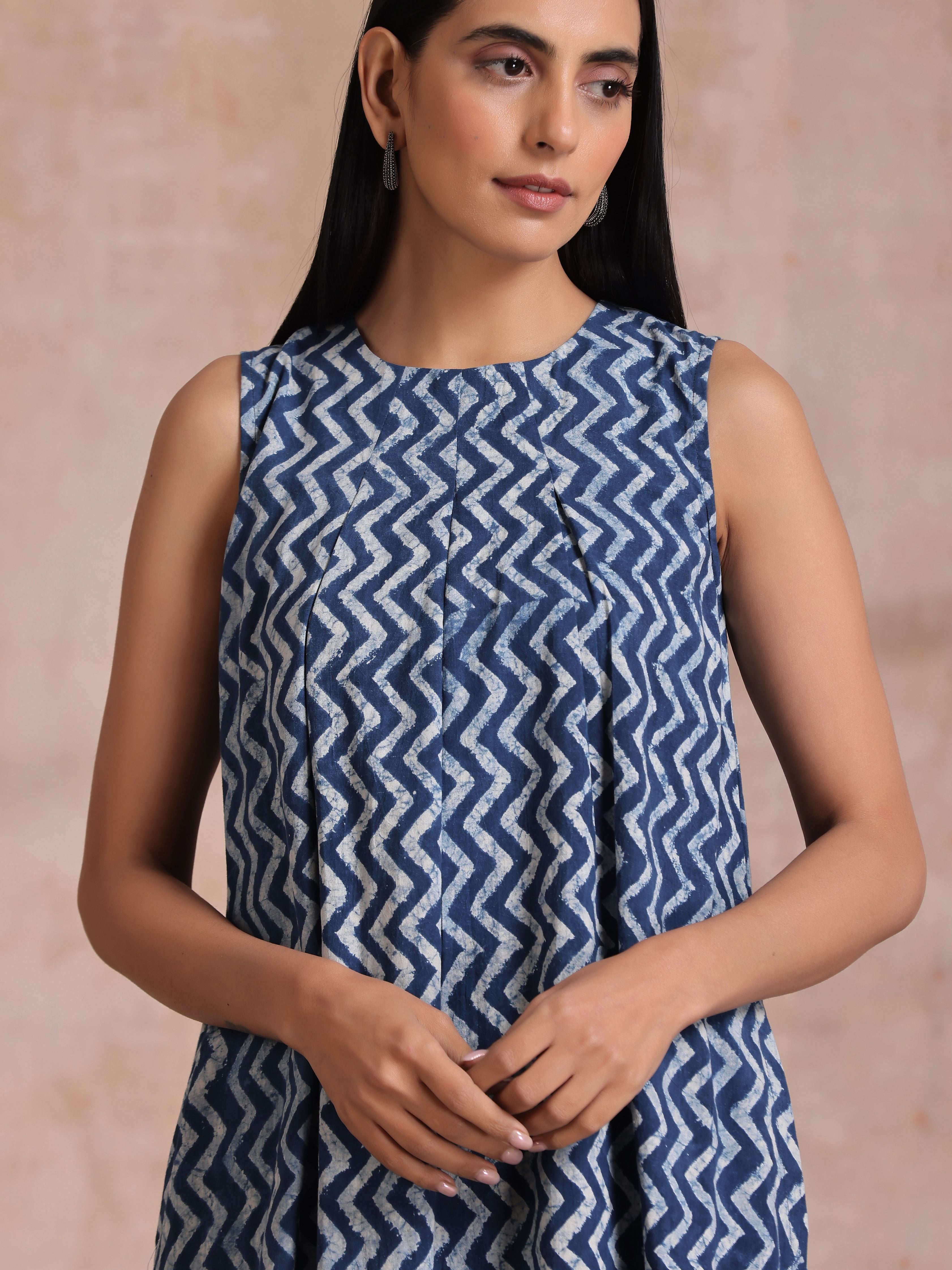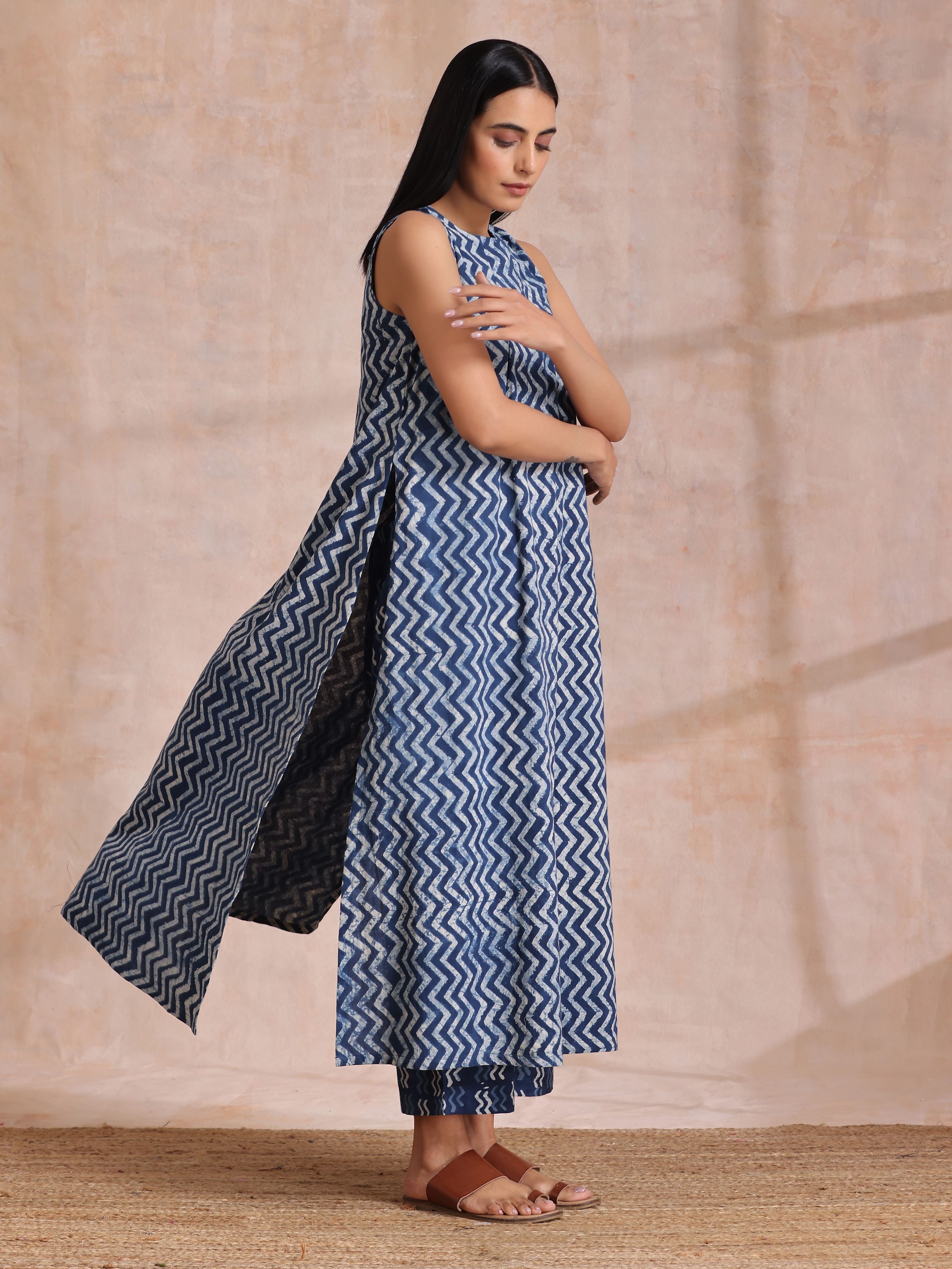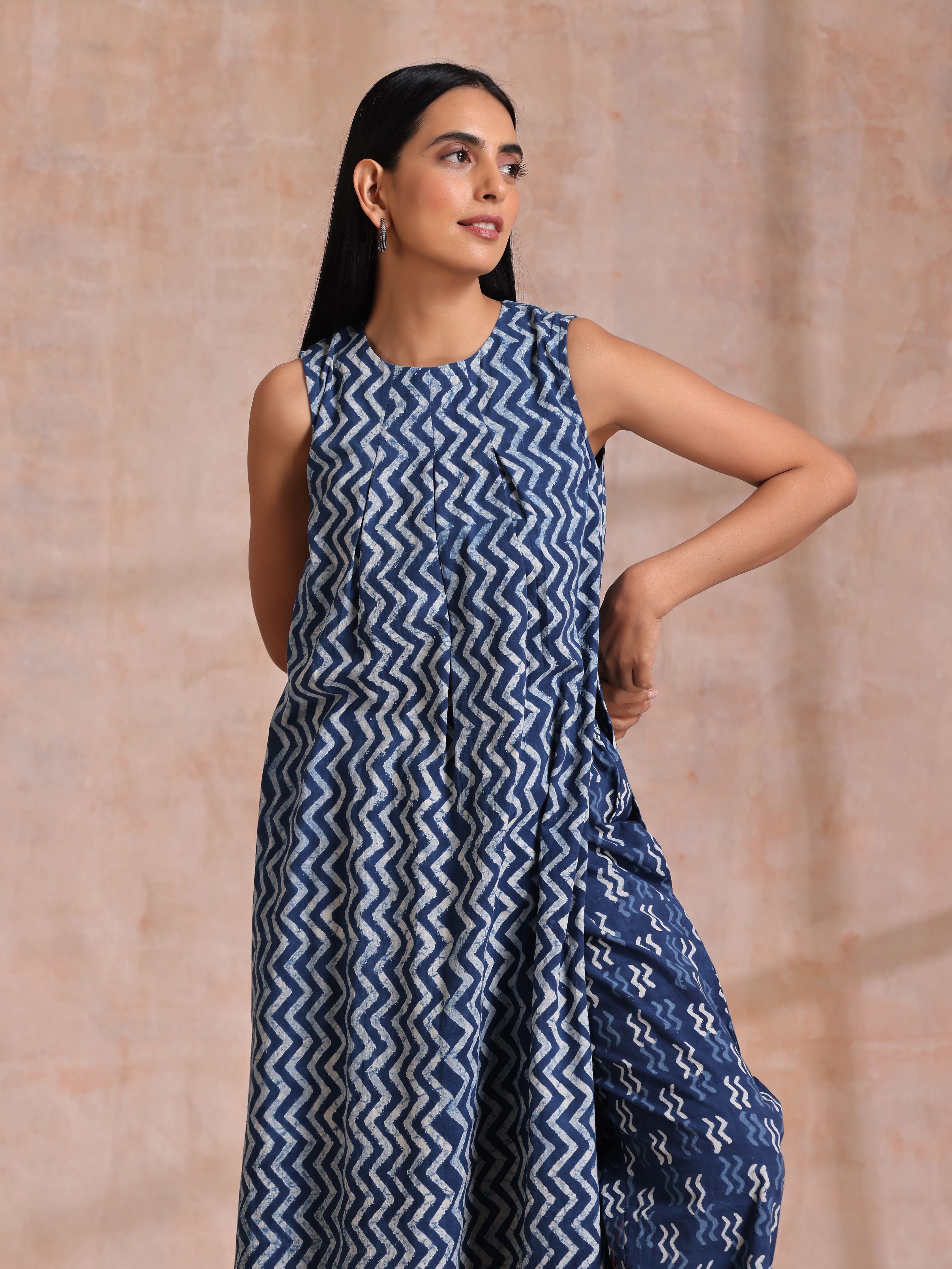 trueBrowns Indigo Dabu Zig-Zag Lines Print Cotton Sleeveless Kurta Pant Set