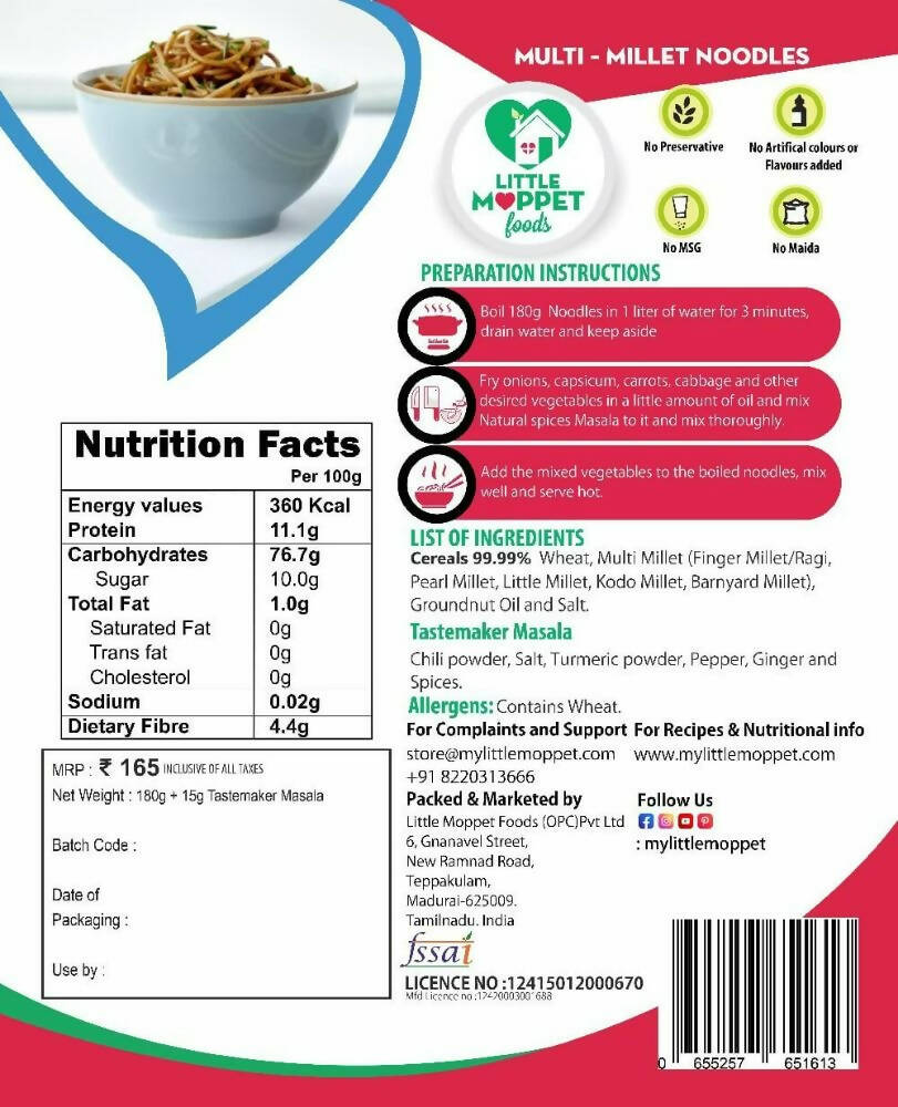 Little Moppet Foods Multi Millet NoodlesAbout the Product:Multi-millet Noodles have the best nutritional combo of five millet varieties which are l...