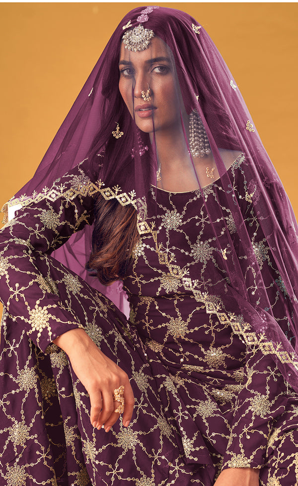 Monjolika Fashion and pattern could be at the peak of your magnificence once you attire this Purple faux georgette palazzo salwar suit. The embroidered work seems chic and great for any get together. Comes with matching Georgette bottom and Net dupatta.