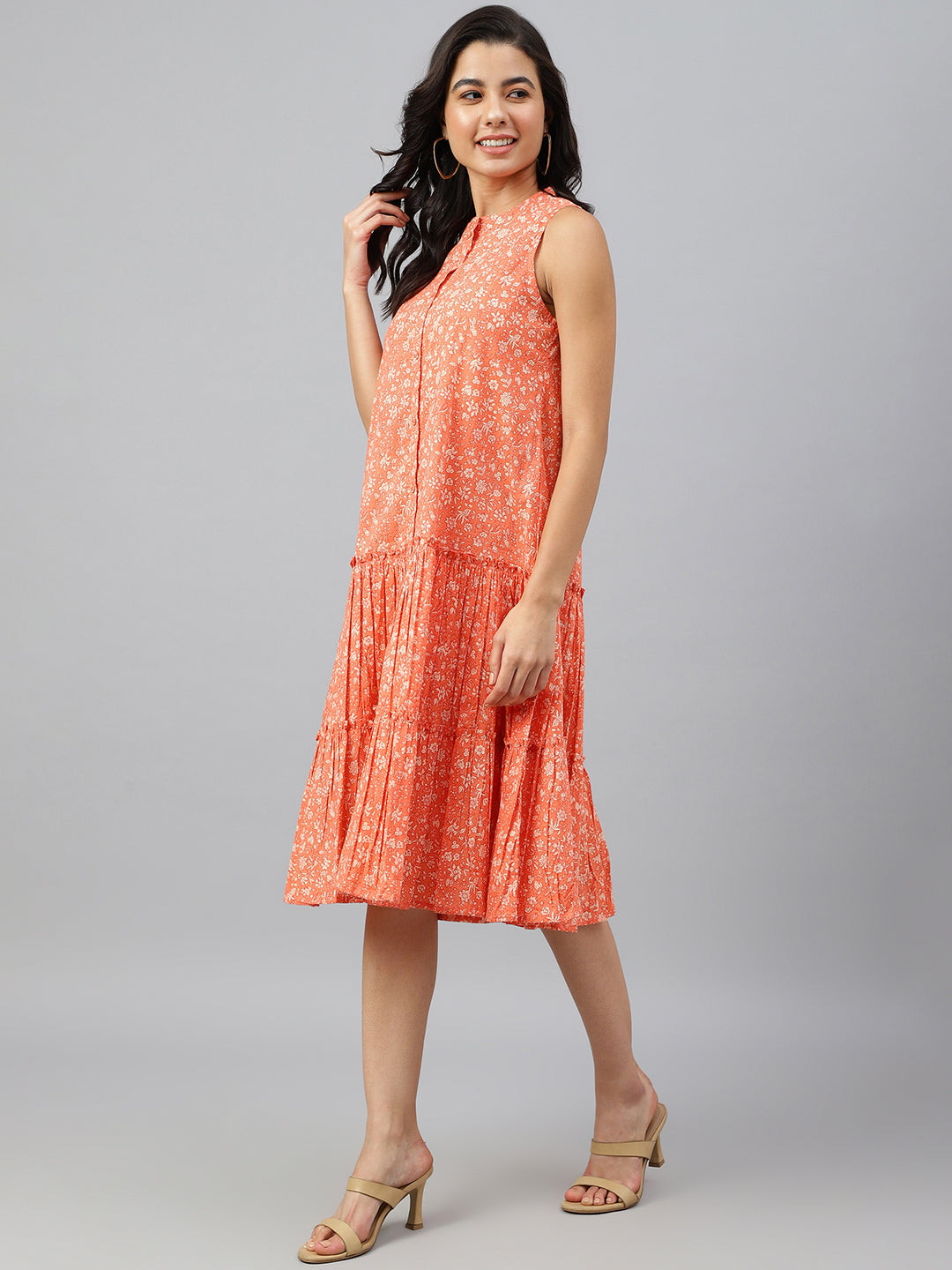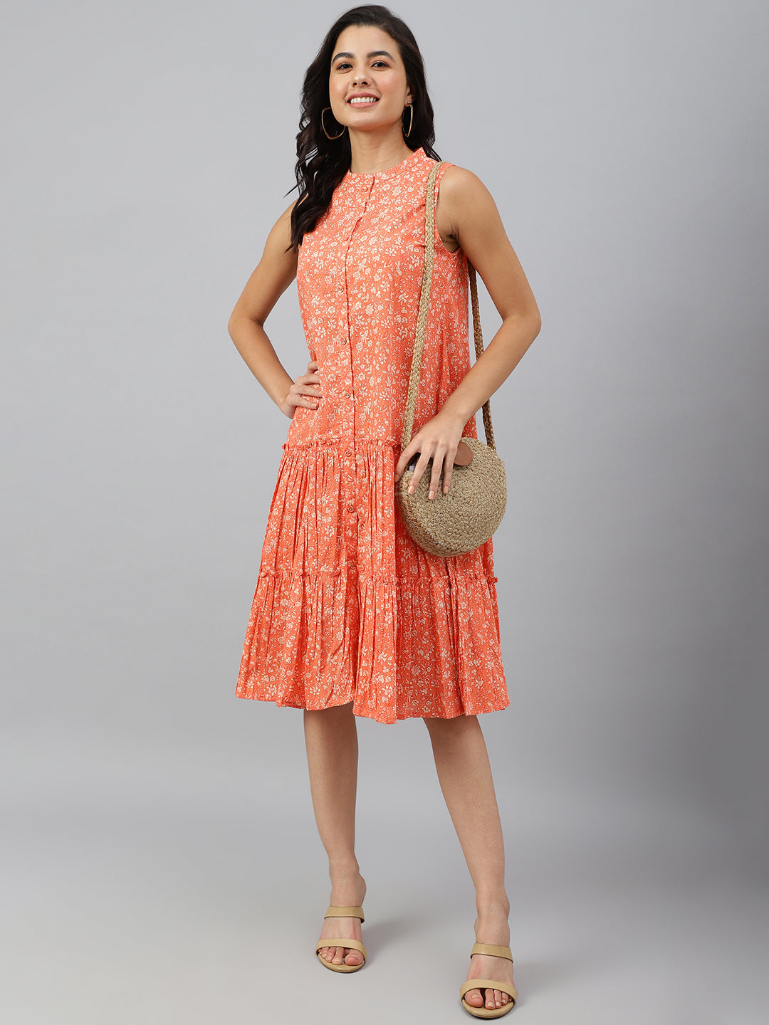Janasya Women's Peach Cotton Floral Printed Flared Western Dress Color: Peach Fabric: Cotton Pattern: Floral Printed Occasion: Casual Sty...