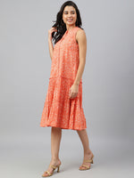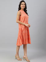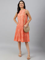 Janasya Women's Peach Cotton Floral Printed Flared Western Dress