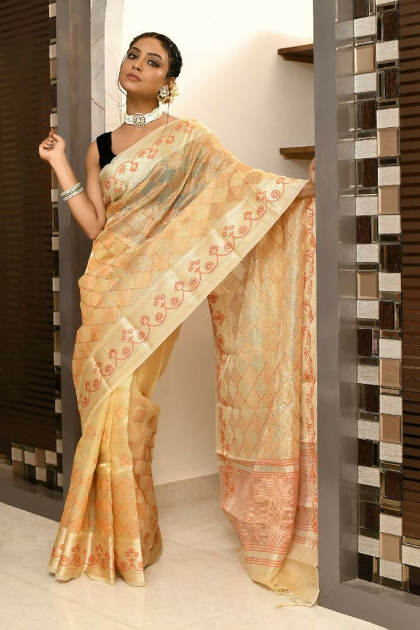 Joban Fashion Light Orange Saree Kota Tissue With Embroidery And Applick Anchal