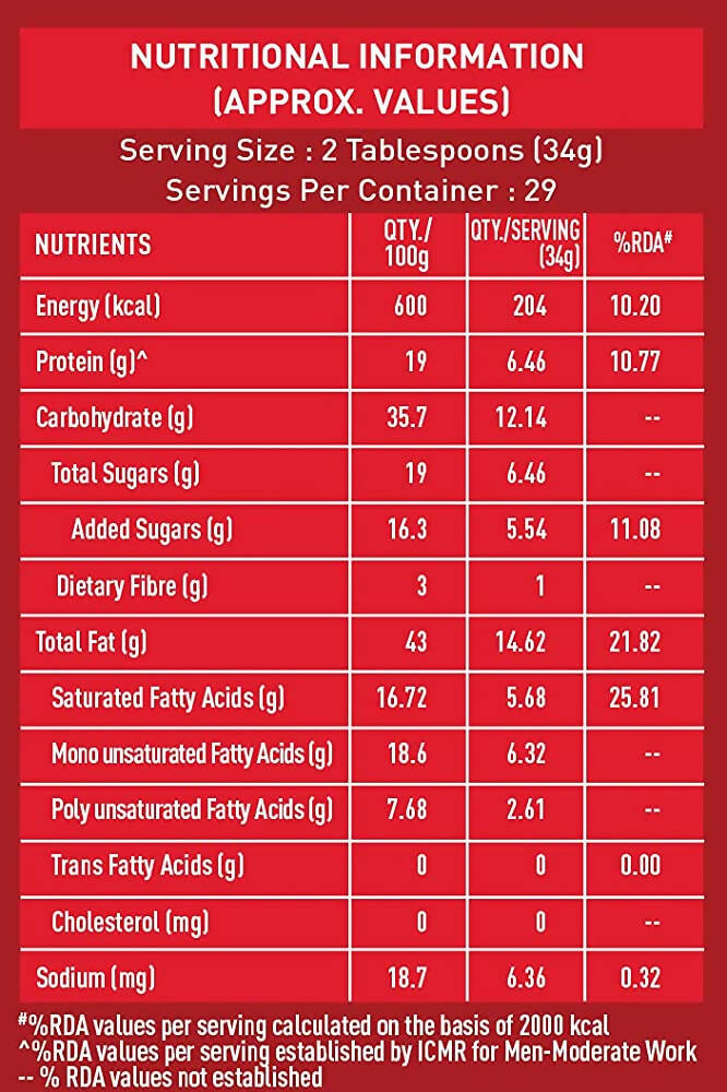 • MuscleBlaze Chocolate Peanut Butter delivers 19 g of protein per 100 g to fulfill the protein needs of your body. Protein is required for lean muscle gain and provides longer satiety