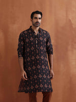 trueBrowns Men's Black Printed KurtaDescription Upgrade your festive wardrobe with this black viscose blend printed kurta. Perfect for any occasion...
