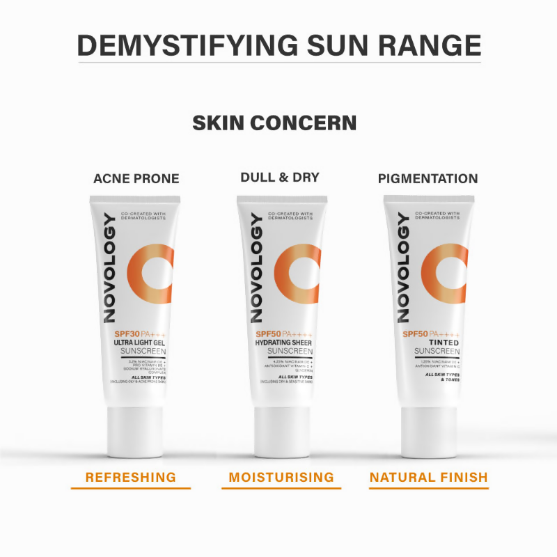 • Introducing Novology's First ever Protect + Correct Sunscreen Range that is Co-created with India's Leading Dermatologists. Novology SPF 50 PA++++ Tinted Sunscreen is clinically proven to Protect from Sun Damage and Correct by reducing dark spots. Its Light-weight, non-greasy texture blends evenly into your skin tone to give you a natural finish.