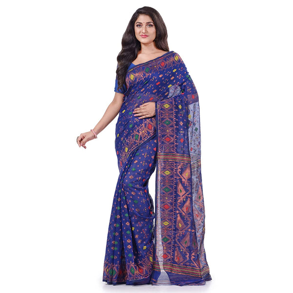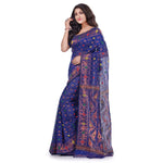 Desh Bidesh Women's Zari Karat Resham Dhakai Jamdani Bengal Pure Cotton Handloom Saree Whole Body Design Without Blouse Piece Saree Color: Blue S...