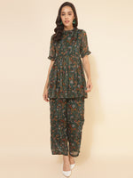 Janasya Green Chiffon Lurex Floral Printed Co-ords - XS