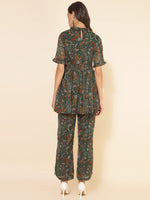 Janasya Green Chiffon Lurex Floral Printed Co-ords