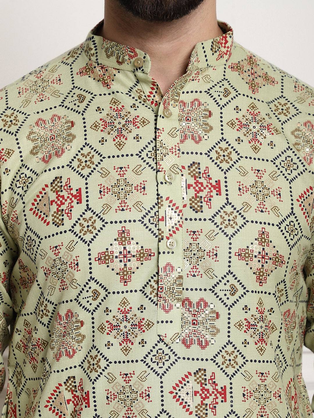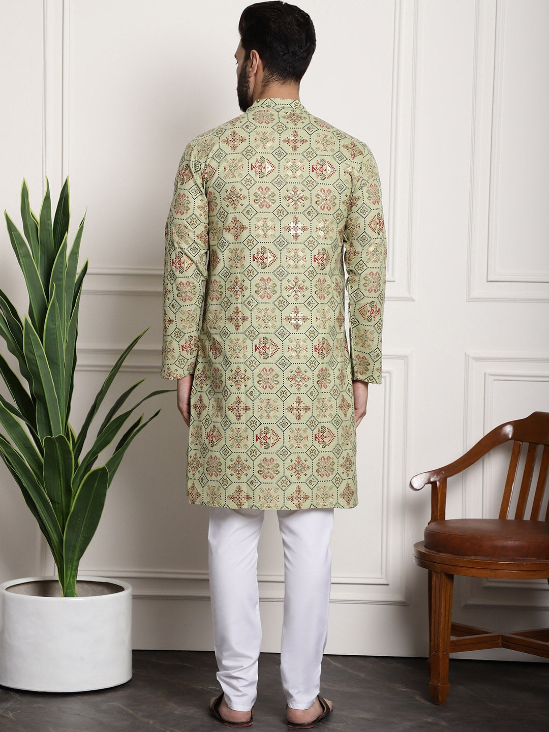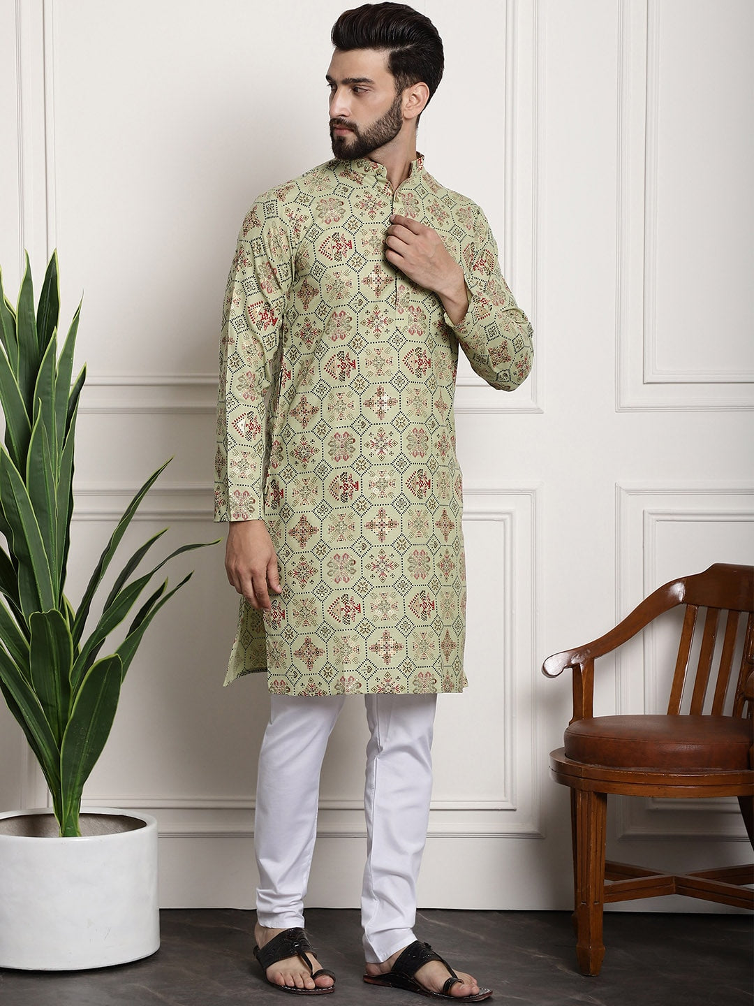Sojanya Men Green Printed Cotton Linen Kurta with Churidar - Distacart