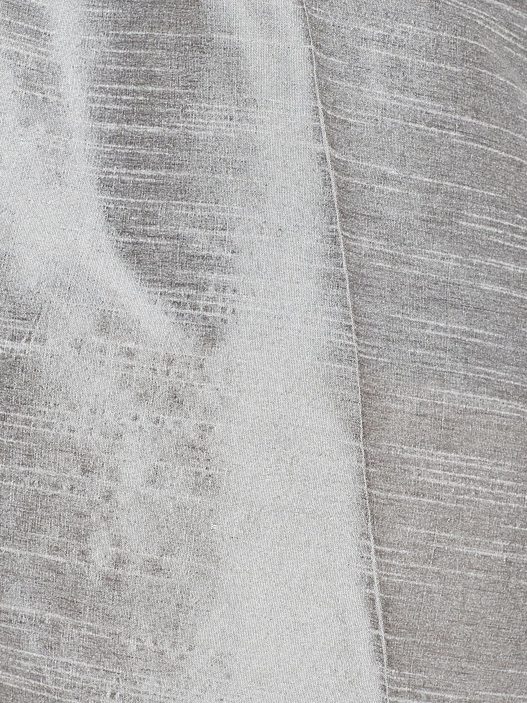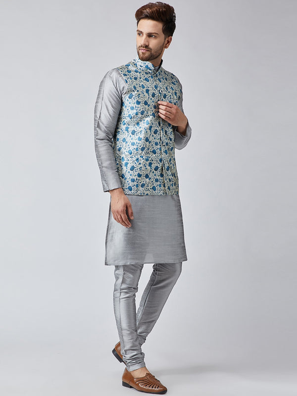 Grey and blue straight knee length kurta, has a mandarin collar, long sleeves, straight hem, side slits