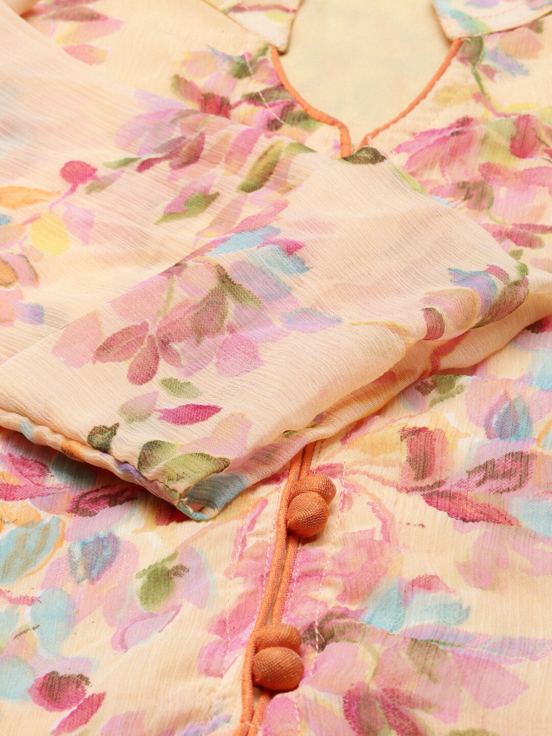 Souchii Peach-Coloured Floral Layered Chiffon Beautiful A-Line Midi Dress Product Details Peach-coloured floral print a-line dress Mandarin col...