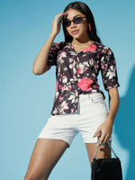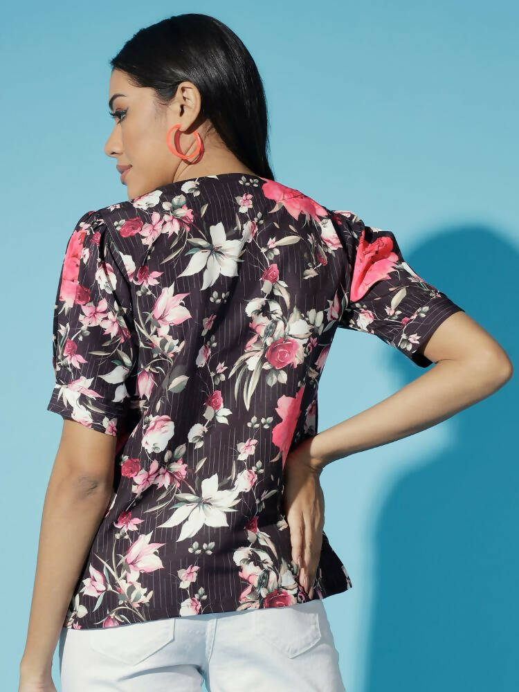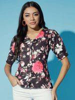 Myshka Women Black Floral V-Neck Regular Sleeves Viscose Rayon TopBlack Viscose Rayon V-Neck Short Sleeves Printed Opaque Floral Floral Regular Sle...