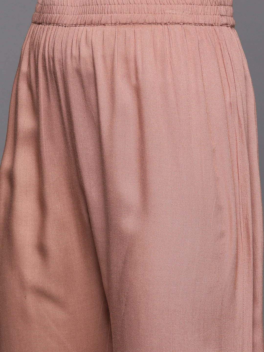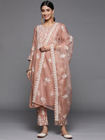 Mauve Embroidered Kurta Paired With Tonal Embroidered Bottom And Dupatta With Two Side Samosa Gota Lace, Kurta Has Round Neck And Three Quarter Sleeves, Straight Kurta With Side Slits