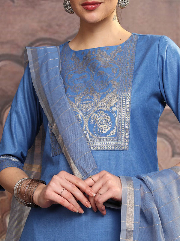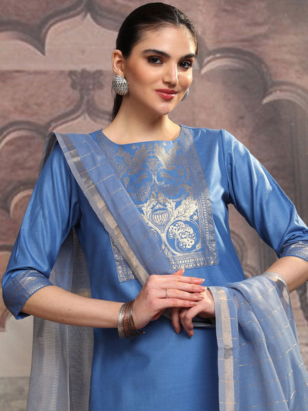 Vishudh Blue Ethnic Motifs Yoke Design Straight Kurta With Trousers & Dupatta