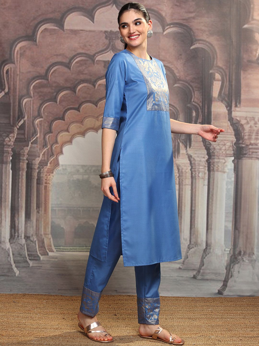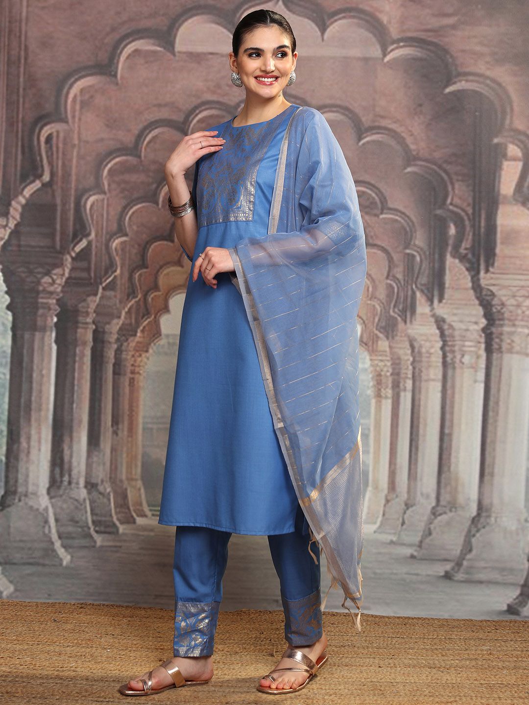 Vishudh Blue Ethnic Motifs Yoke Design Straight Kurta With Trousers & Dupatta Product Details Blue yoke design Kurta with Trousers & dup...