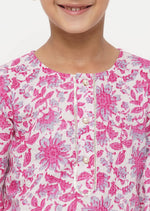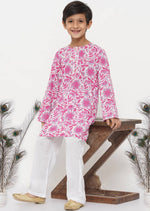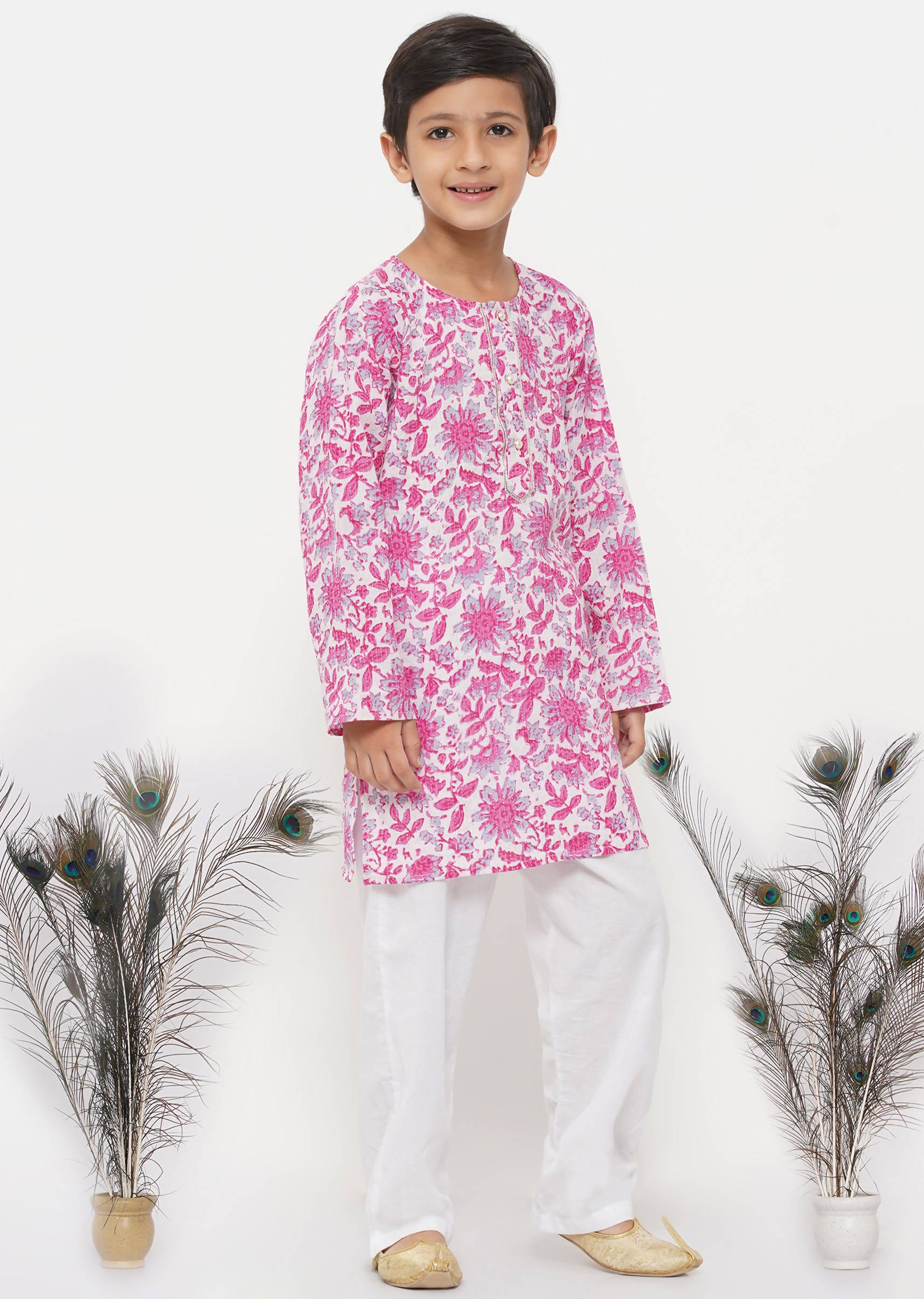 Little Bansi Boys Cotton Floral Kurta with Pearl Buttons & Pyjama in Pink & Cream - 0-3m