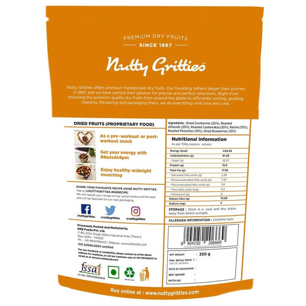 Nutty Gritties Sports MixA mix of Roasted Almonds, Roasted Cashews, Roasted Pista Kernels, Dried Cranberries, Dried Blueberries, and Raisins. Legal...