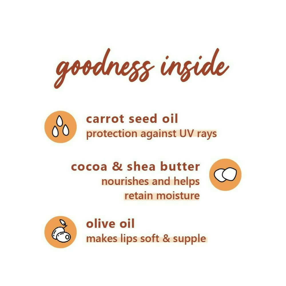 • Nourishing carrot seed oil to repair sun-damaged and chapped lips