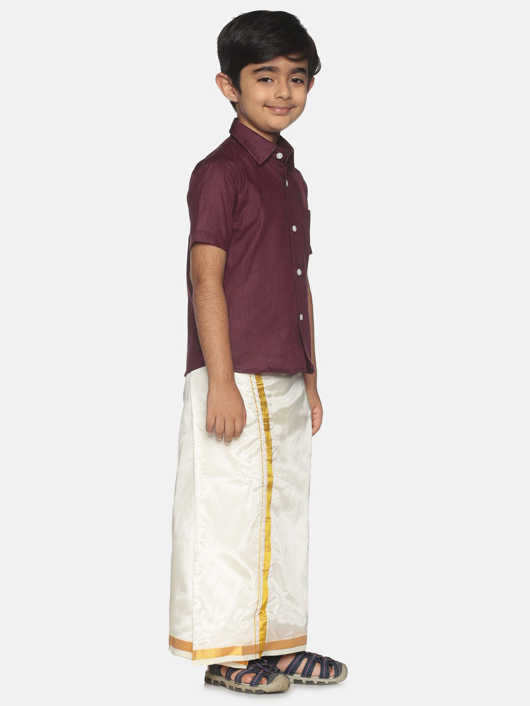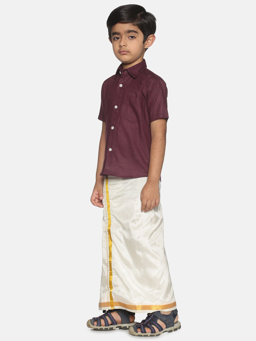 Sethukrishna Boys Maroon & White Pure Cotton Shirt with Dhoti