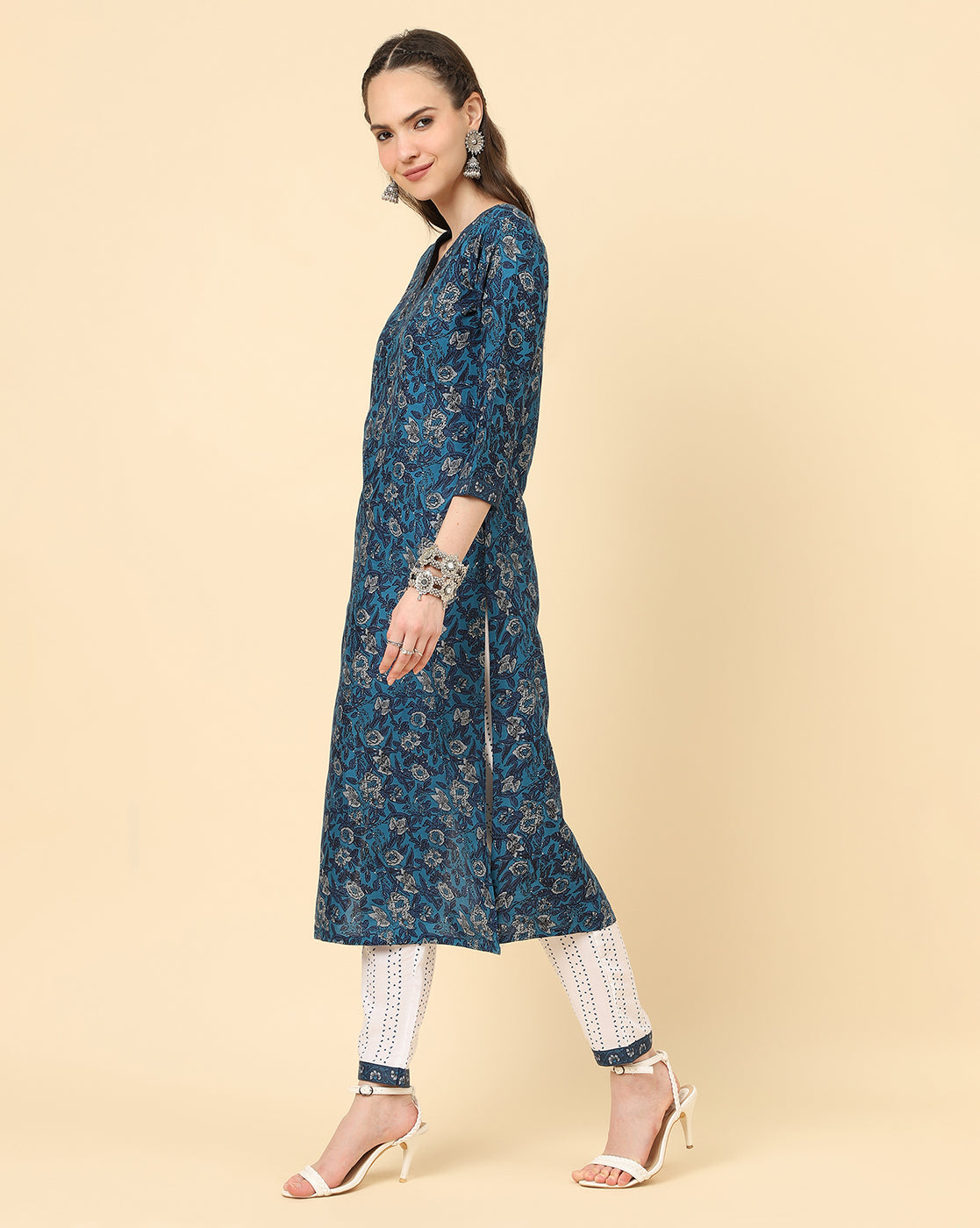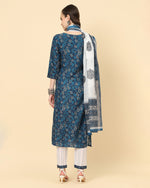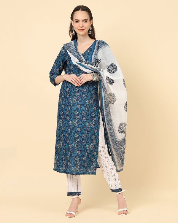 Varanga Women Navy Blue Viscose Rayon Printed Regular Kurta With Trousers & Dupatta - S