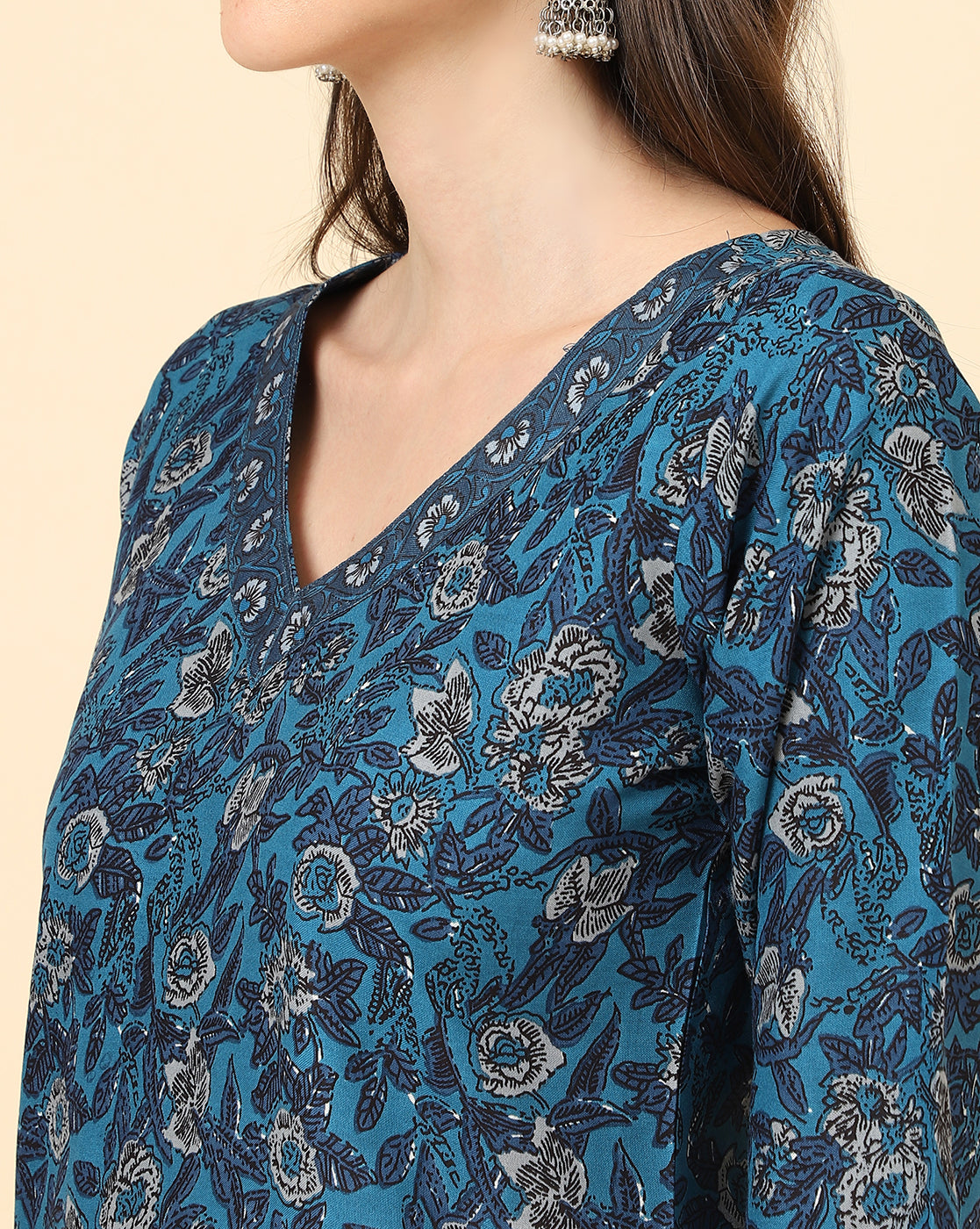 Varanga Women Navy Blue Viscose Rayon Printed Regular Kurta With Trousers & DupattaElegance And Honourable Come Together In This Beautiful Drap...