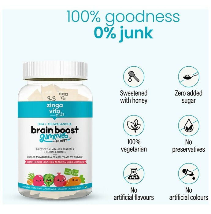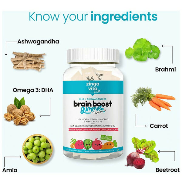 Zingavita DHA Brain Boost Gummies for Kids (2+ yrs) Strawberry Lemon FlavorIngredients:Amla, Carrot, Ashwagandha, Omega3, Brahmi, Beetroot Extracts...