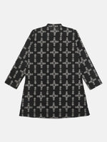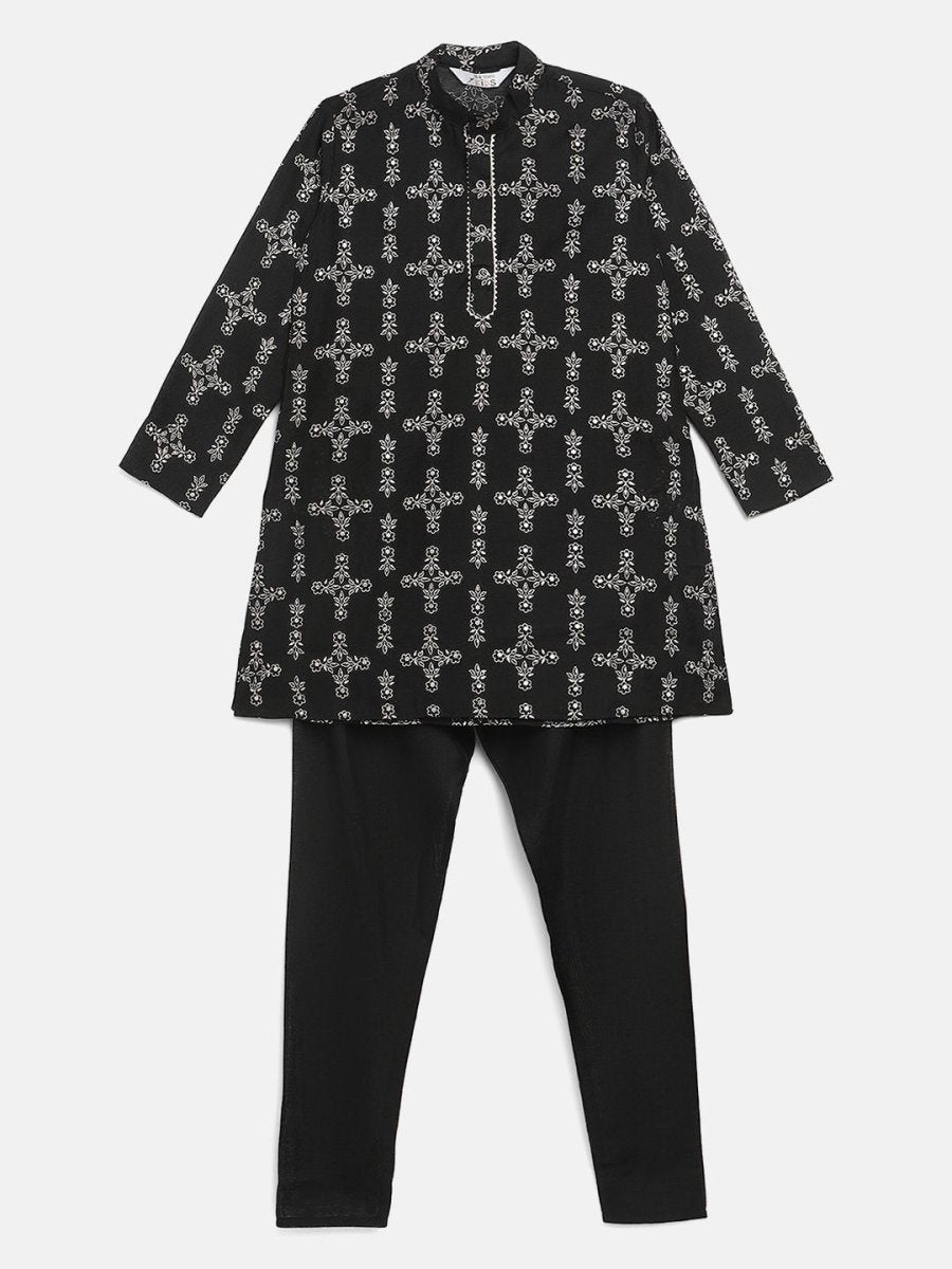 Ahalyaa Boys Black Chanderi Gold Printed Kids Kurta Churidar SetPut forward your son's best traditional look by choosing this kurta Churidar set fo...