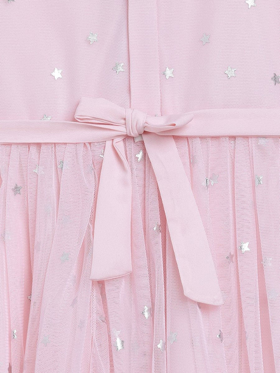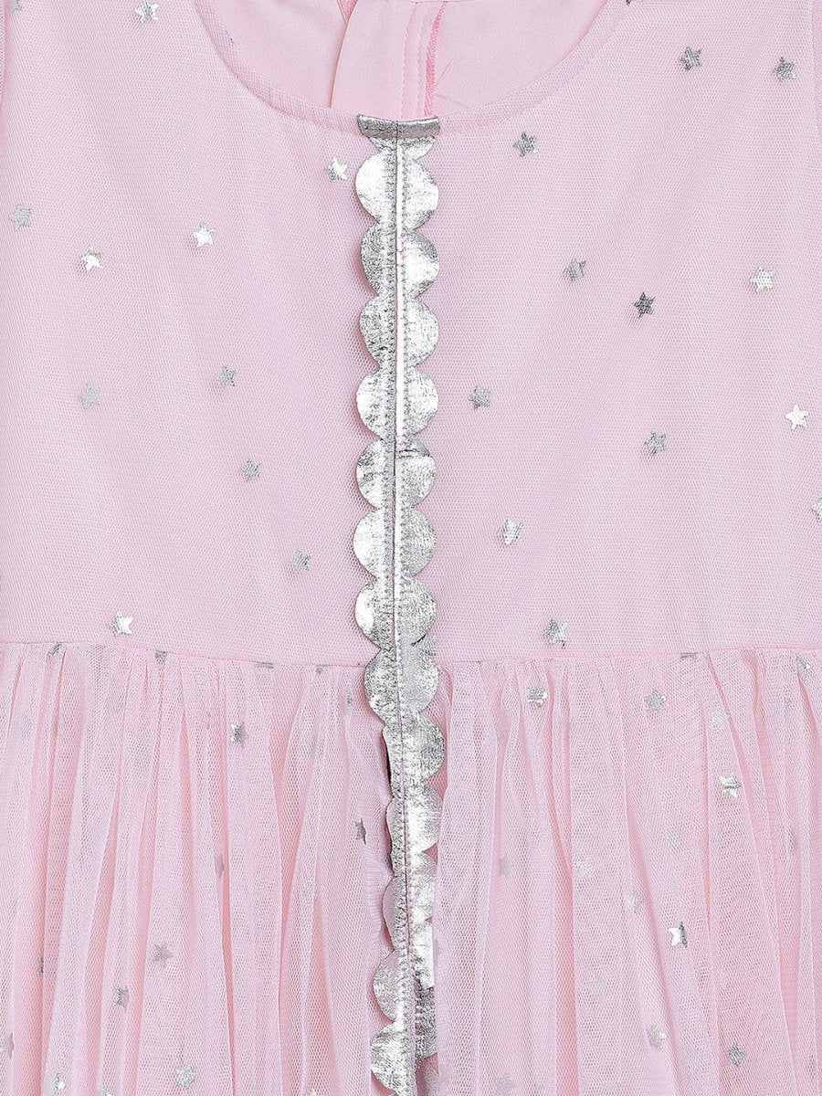 This Ahalyaa kurti is an elegant pastel long anarkali kurta for girls. Perfect ethnic pick for your little princess. The pink faux silk-like material looks rich with a metallic gold print all over giving it a brocade look.