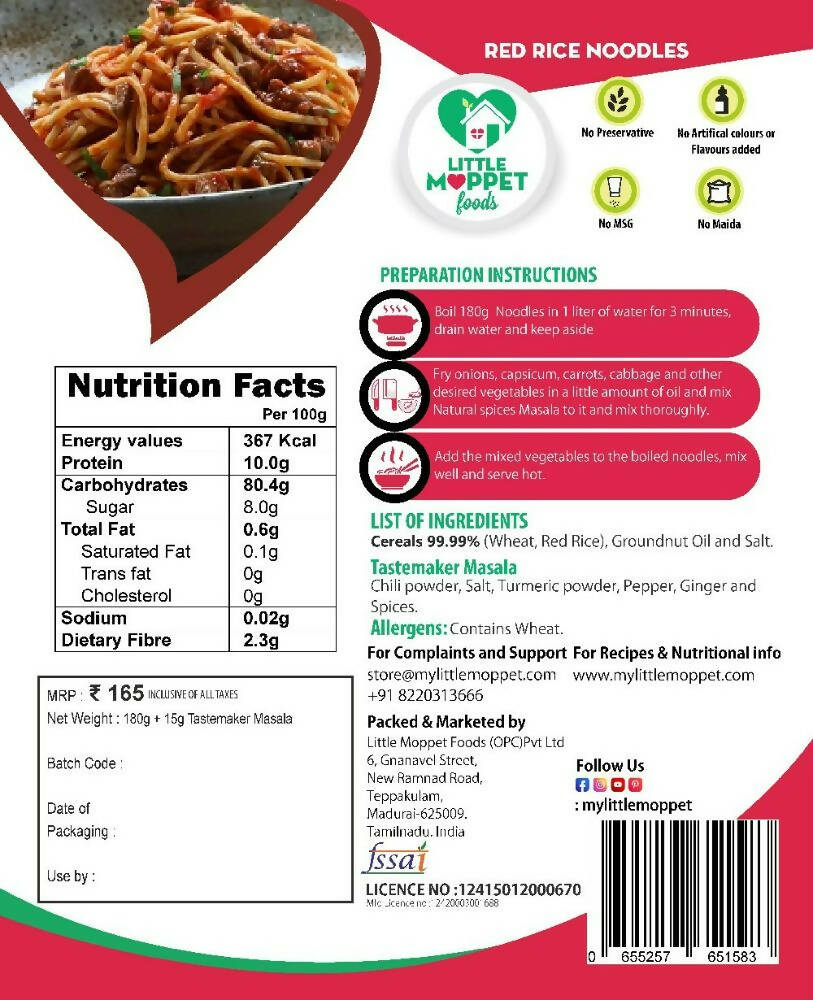 Little Moppet Foods Red Rice NoodlesEach pack contains 180 grams + 15 grams taste maker masalaIngredients: Wheat Red Rice Groundnut Oil Salt. Tast...